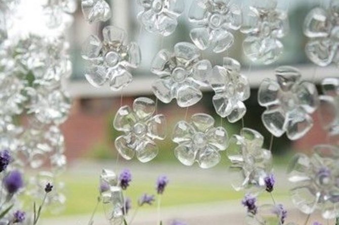 Легким рухом скляна пляшка перетворюється на оригінальну прикрасу. До речі, цей варіант врятує, якщо вам подарували багато квітів, а такої ж кількості ваз просто немає.