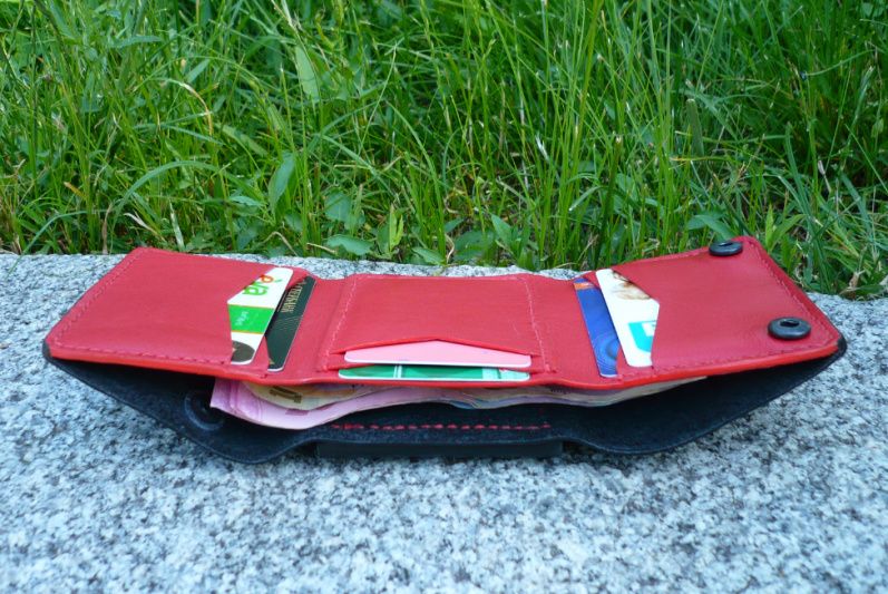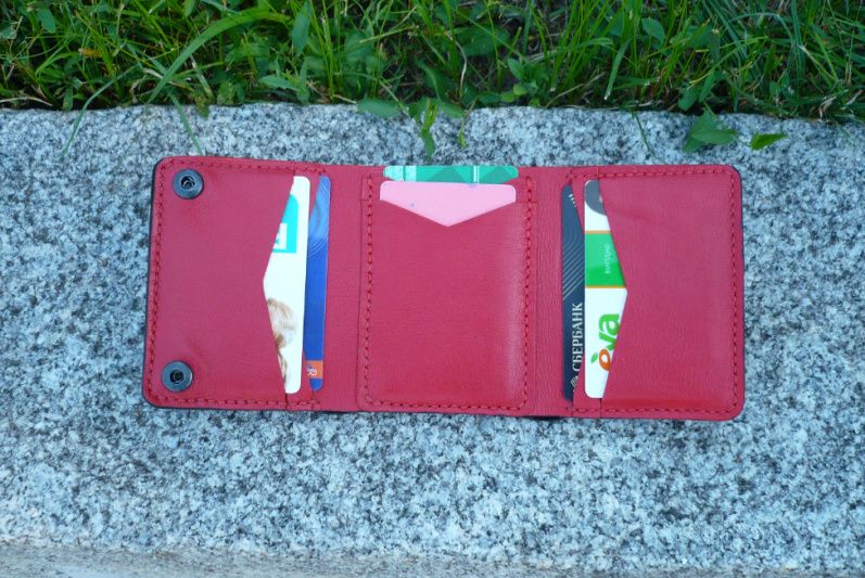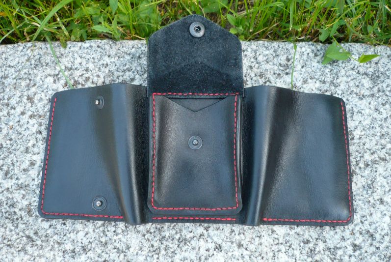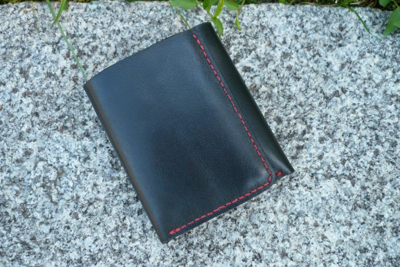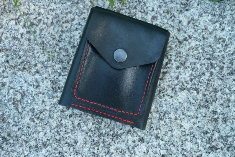 Кошелек тройного добавления из комбинированной кожи производство Италия. Лицевая часть выполнена из кожи краст черного цвета, внутренняя часть кожи – красный гранат. 6 карманов для карт, отделение для купюр, монетница. Урезы отделаны краской fenice черного и красного цвета. Прошитый вощеной нитью galaces 0,55 mm. Финишное покрытие крем kenda farben antiqua super. Ручная работа. Цена 550 грн.