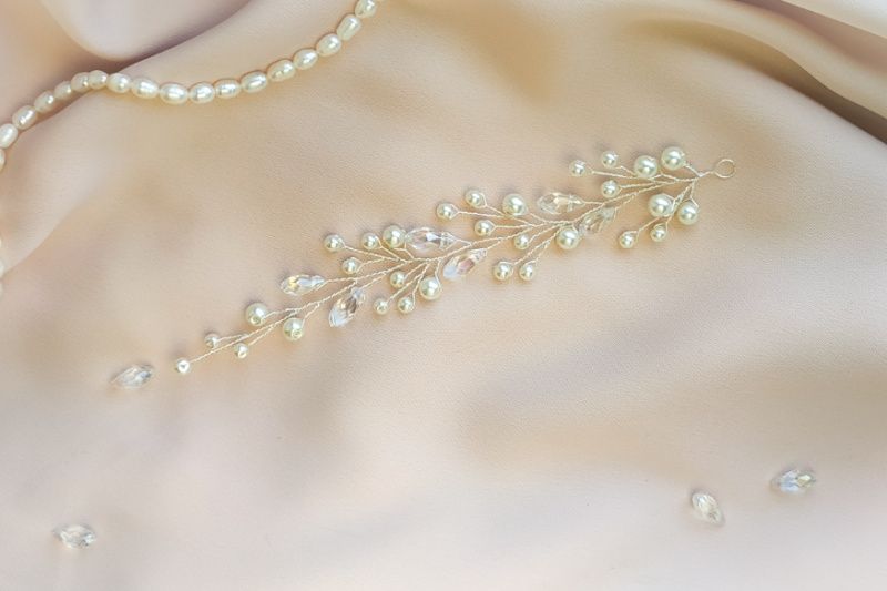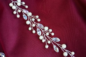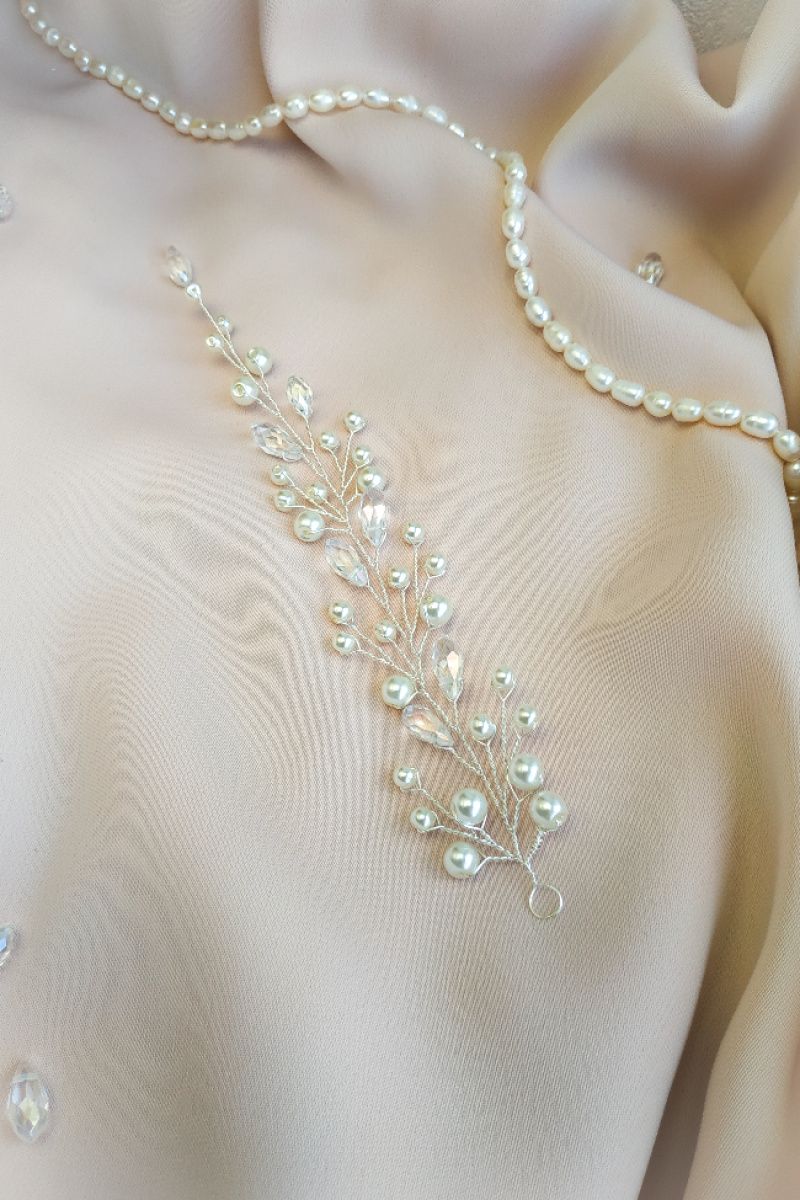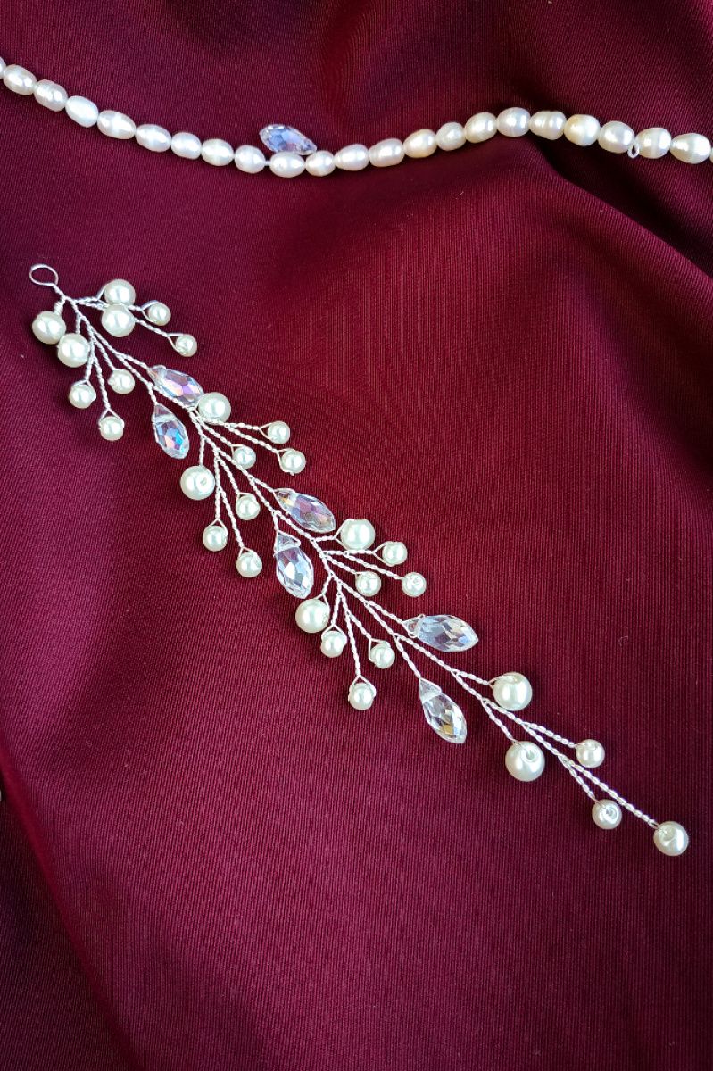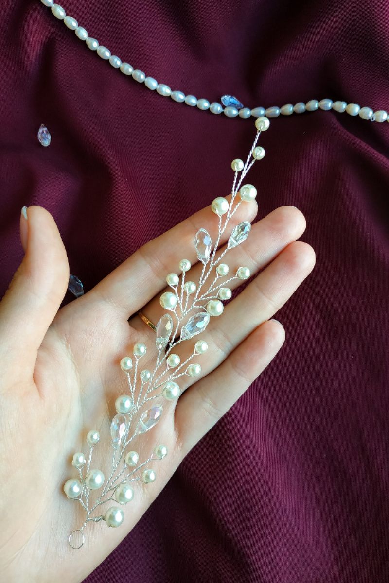 Нежная классическая веточка по имитации жемчуга и хрусталя для вашего неповторимого образа. Будет очень нежно и изысканно выглядеть во множестве причесок (все виды пучков, "мальвинки", кудри и т.д.) Хрустальные капли очень красиво блестят и переливаются как на солнышке так и при искусственном освещении. Жемчуг придают изысканность образу. Сплетенное украшение на английском ювелирном проводе. Длина – 15 см. Также к любому украшению можно подобрать серьги, браслет и даже колье. Если налицо такого нет – можно изготовить индивидуально по вашим пожеланиям и именно под ваш уникальный образ. Обращайтесь – буду рада помочь :)
