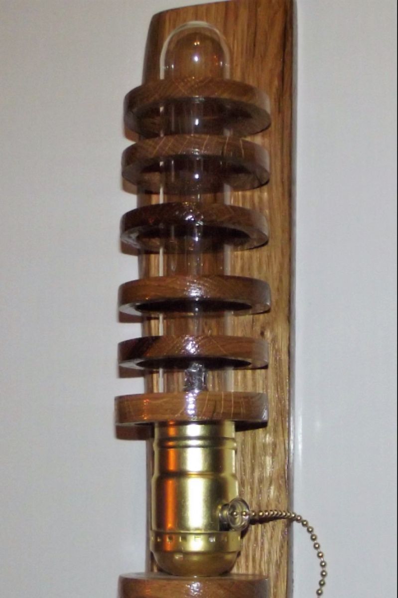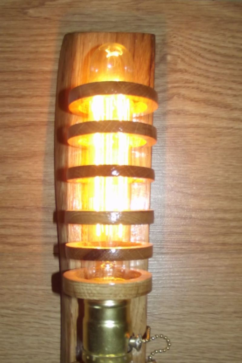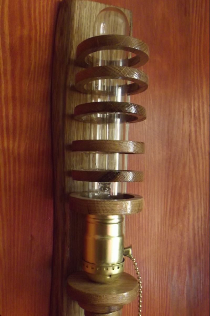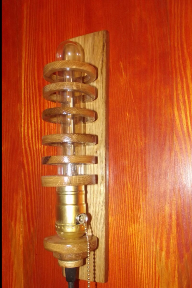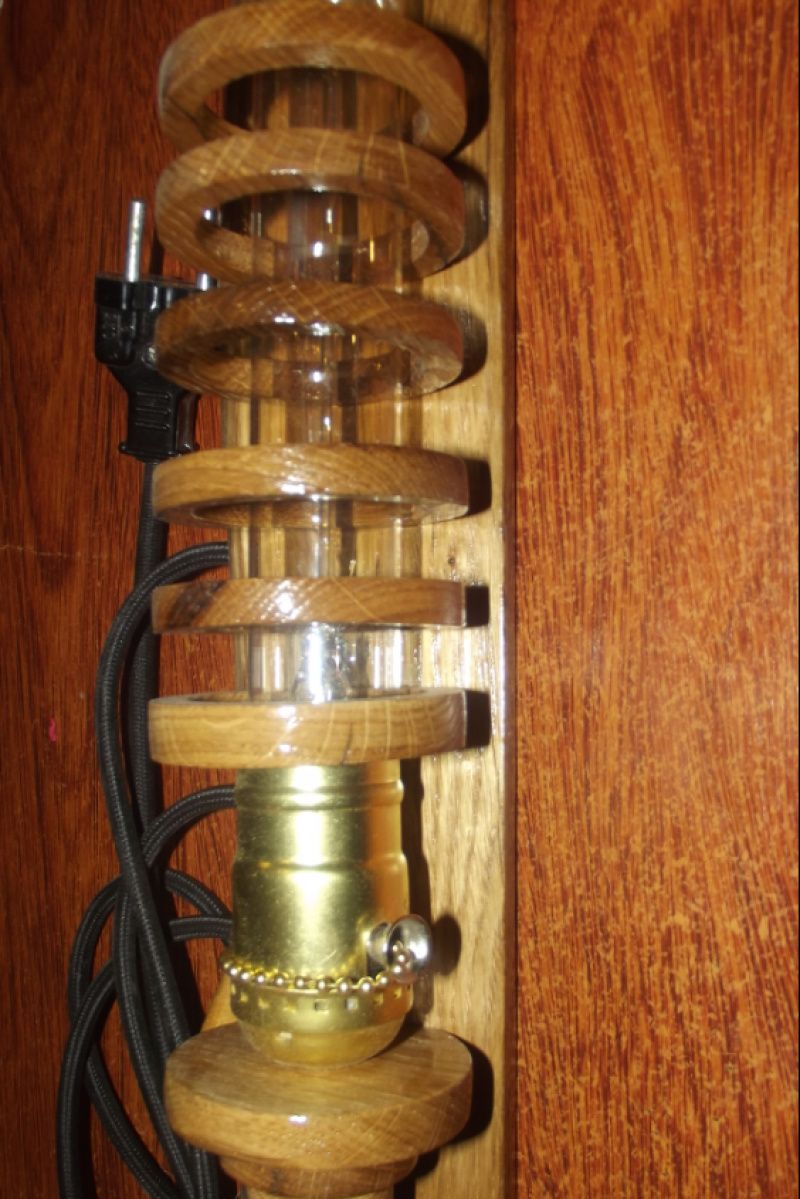 Бра ручной работы с ретро лампой. Материал - дуб, покрытие - лак глянец, патрон с выключателем, провод - черный в тканевой обмотке. Размеры: Высота - 30 см, ширина - 7 см, длина шнура питания - 2м. Патрон - алюминий под золото с зипером Ретро вилка Ретро лампа T185 - 40 Вт, температура свечения 2700 К Цвет свечения Теплая Напряжение питания 220 В Диаметр 3 см Длина 18,5 см