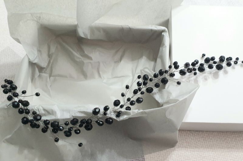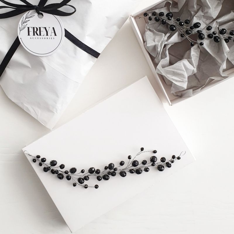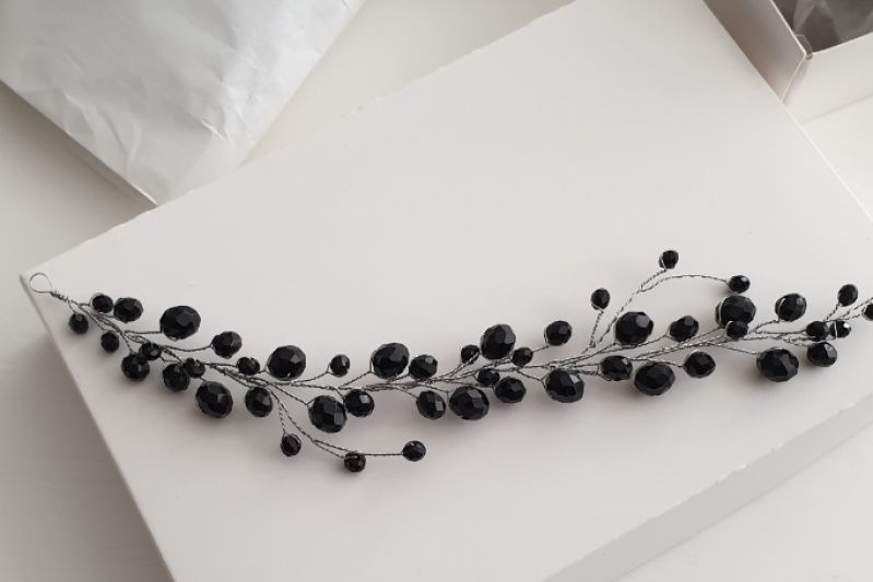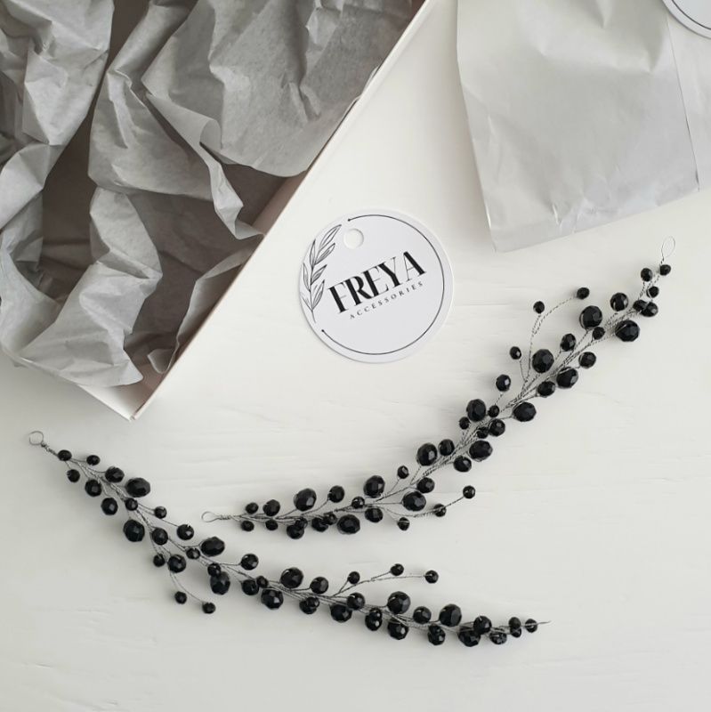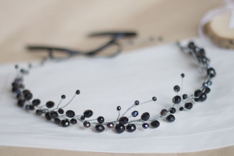 Мини-веточка "Черный хрусталь" выполнена из хрустальных бусин длина 15-16 см Основа - серебристая проволока Возможно исполнение как полноценного венчика и в другом цвете.