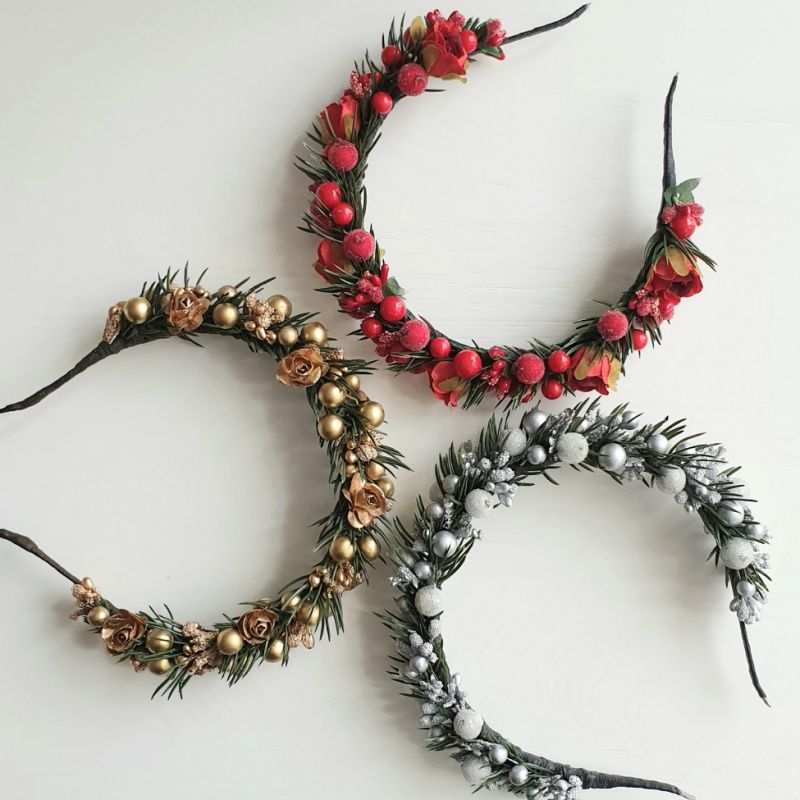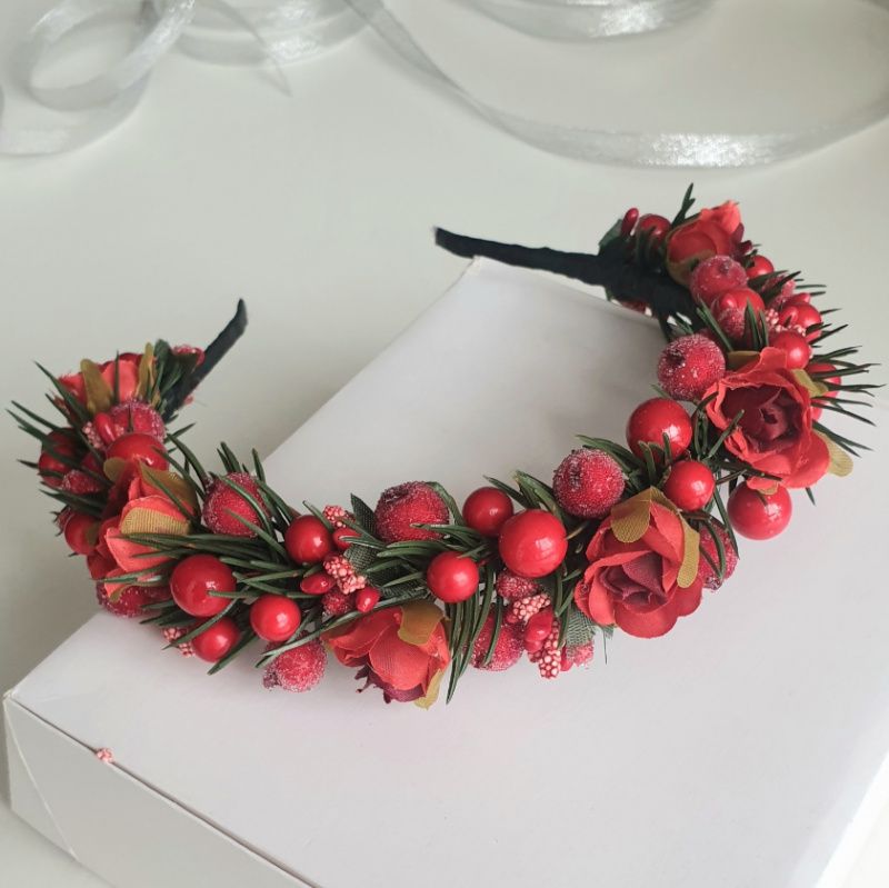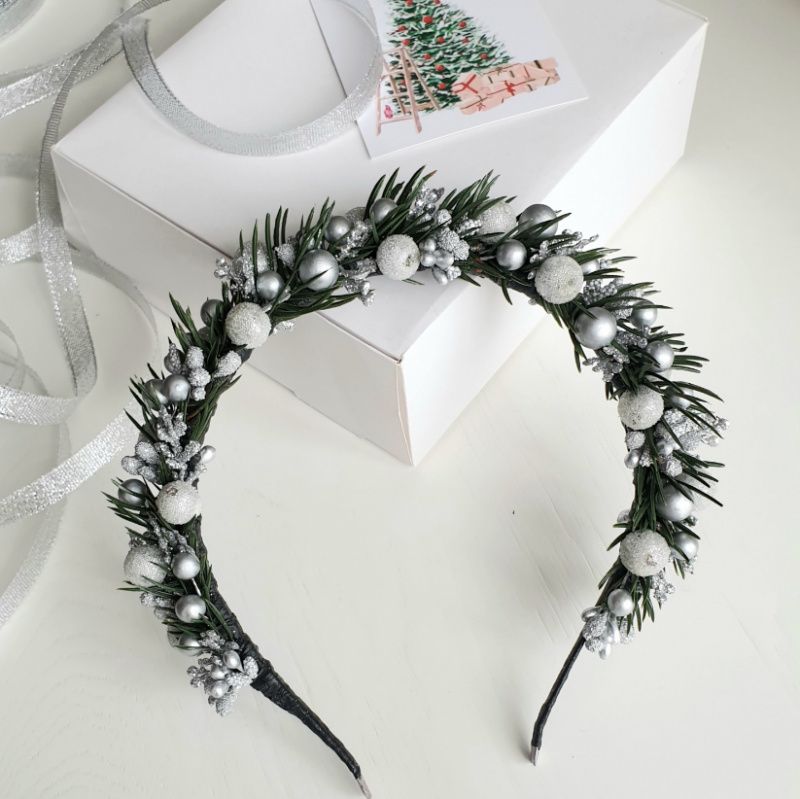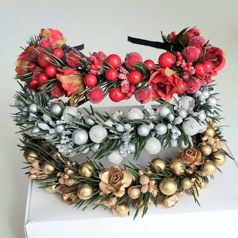 Новогодний обруч с елкой и ягодками Возможен в 3 цветах: - красный -золотой -серебряный Основание - металл, обруч, универсальный размер. Подойдет и взрослому, и ребенку.