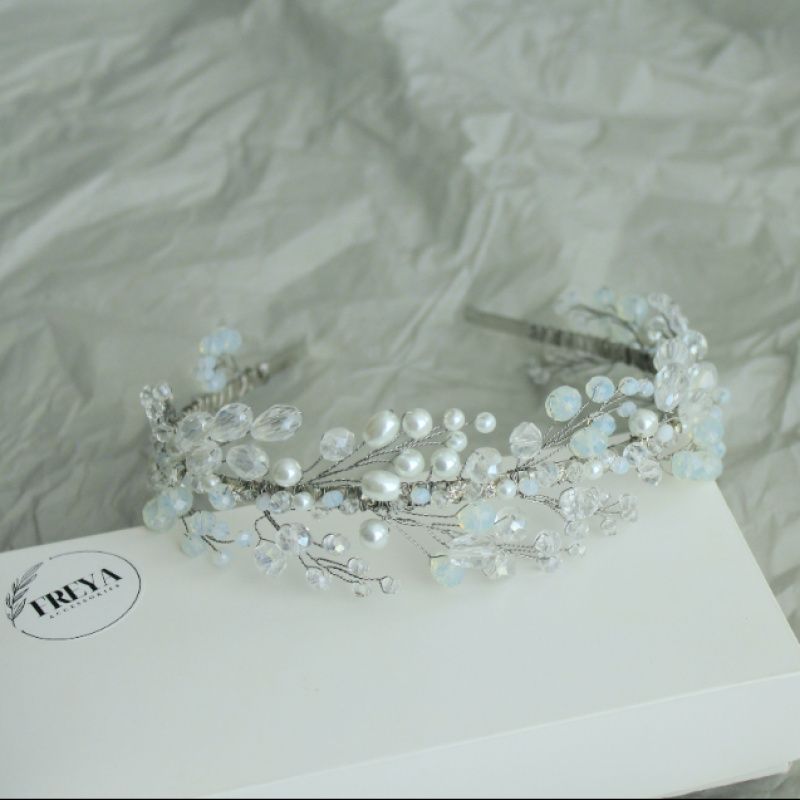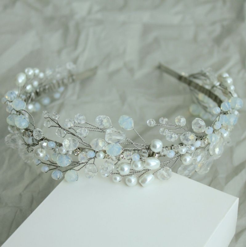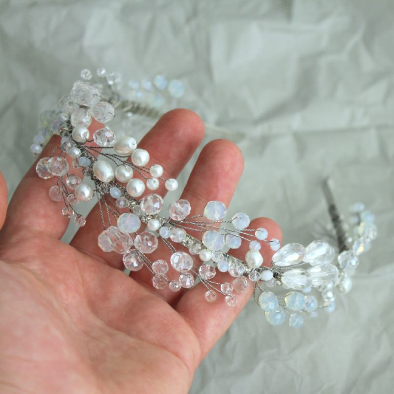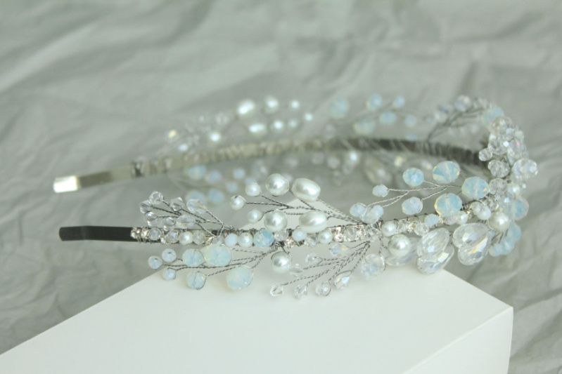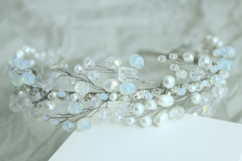 Тиара изготовлена из качественных хрустальных бусин прозрачного и лунного цвета + бусины-жемчужины Каждая веточка движется и можно расположить в прическе как нужно Выполнено на серебряном проводе Возможно исполнение в других цветах Основа - металлический серебряный обруч