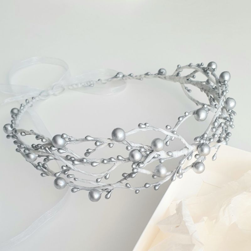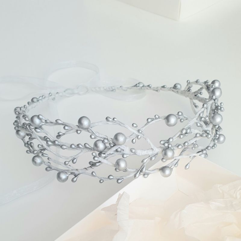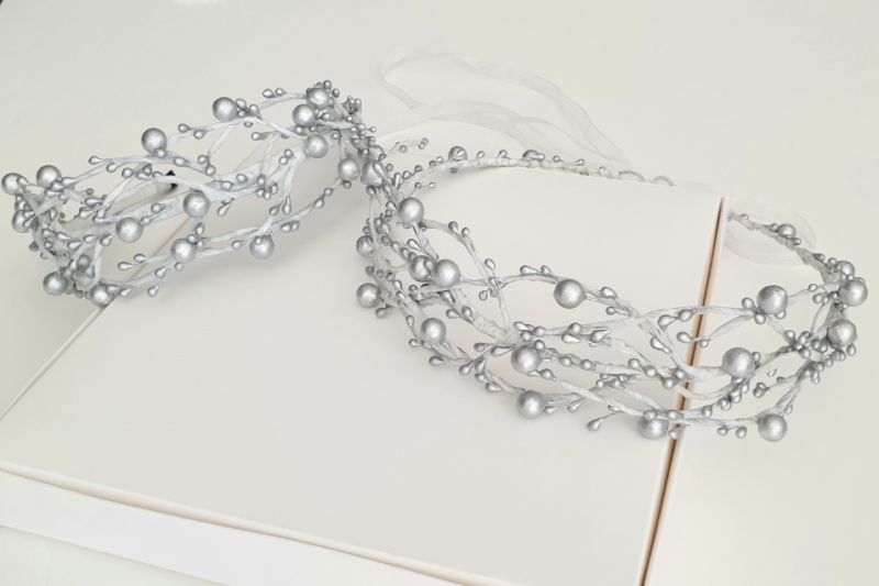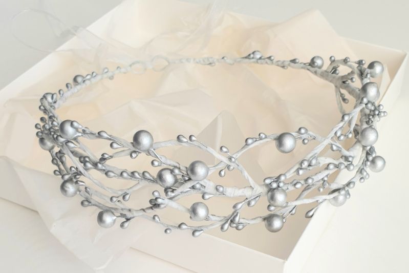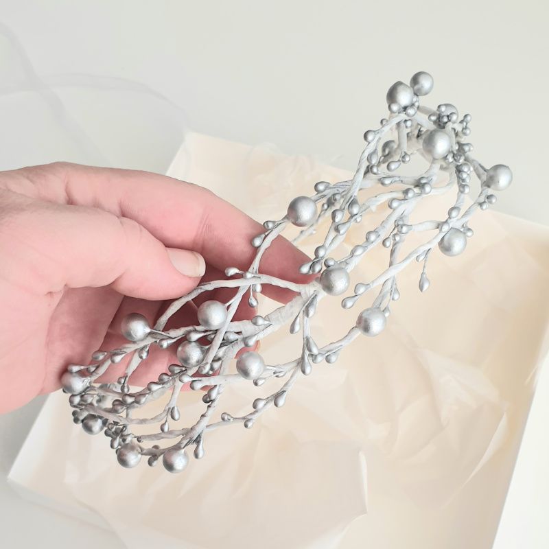 Венчик с серебристыми ягодками и почками, на белой основе. Идеально подойдет к зимним праздникам, праздничных новогодних костюмов и т.д.
