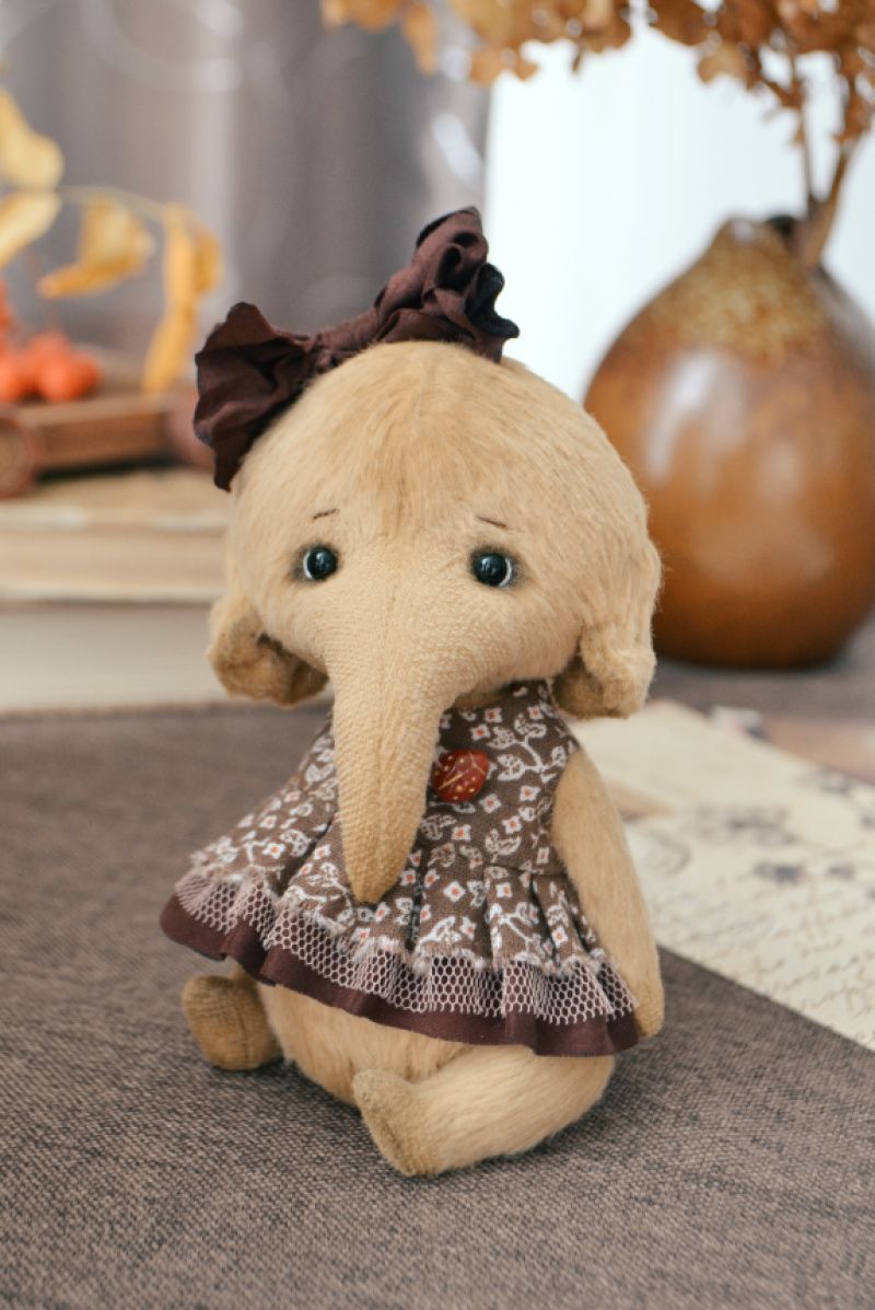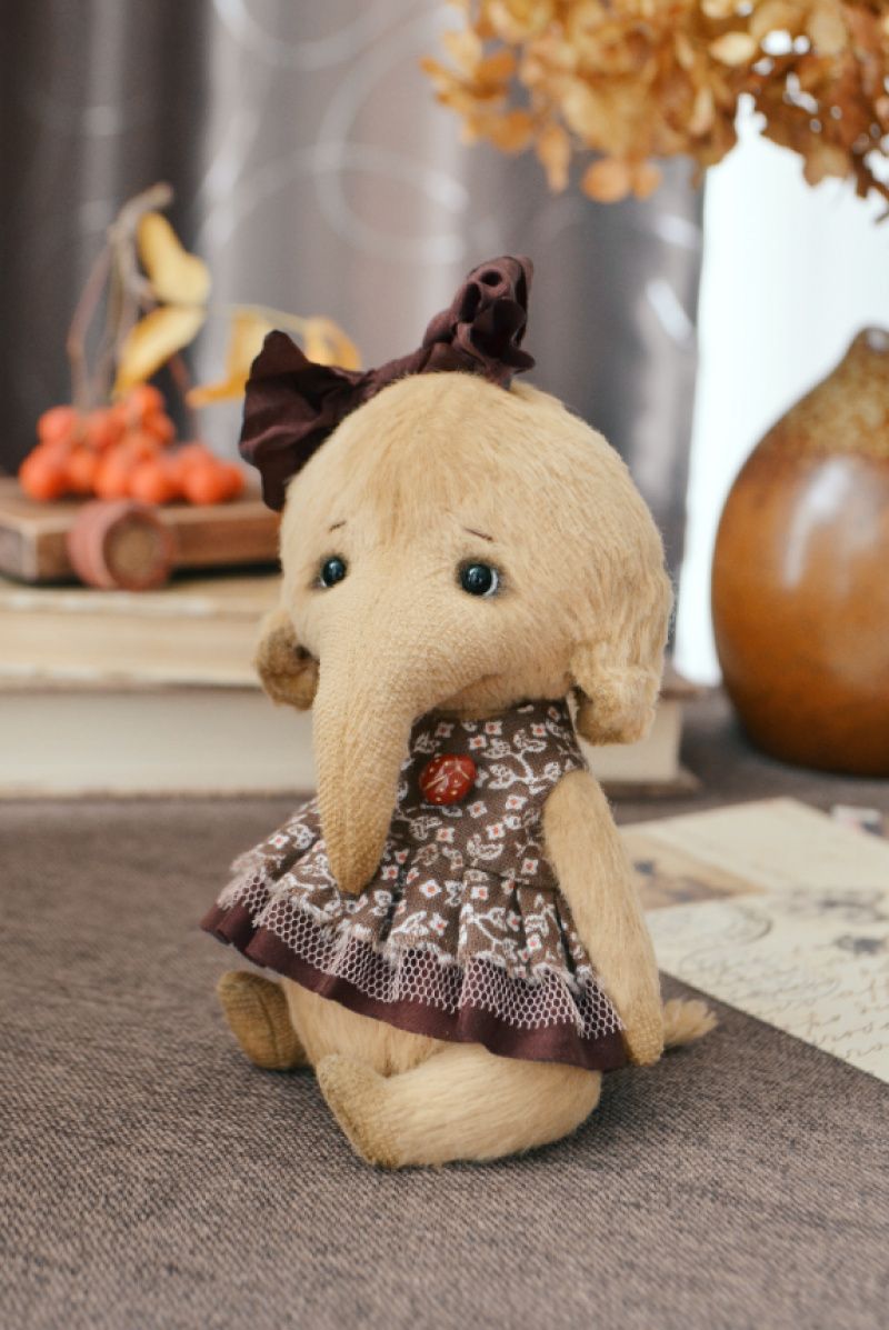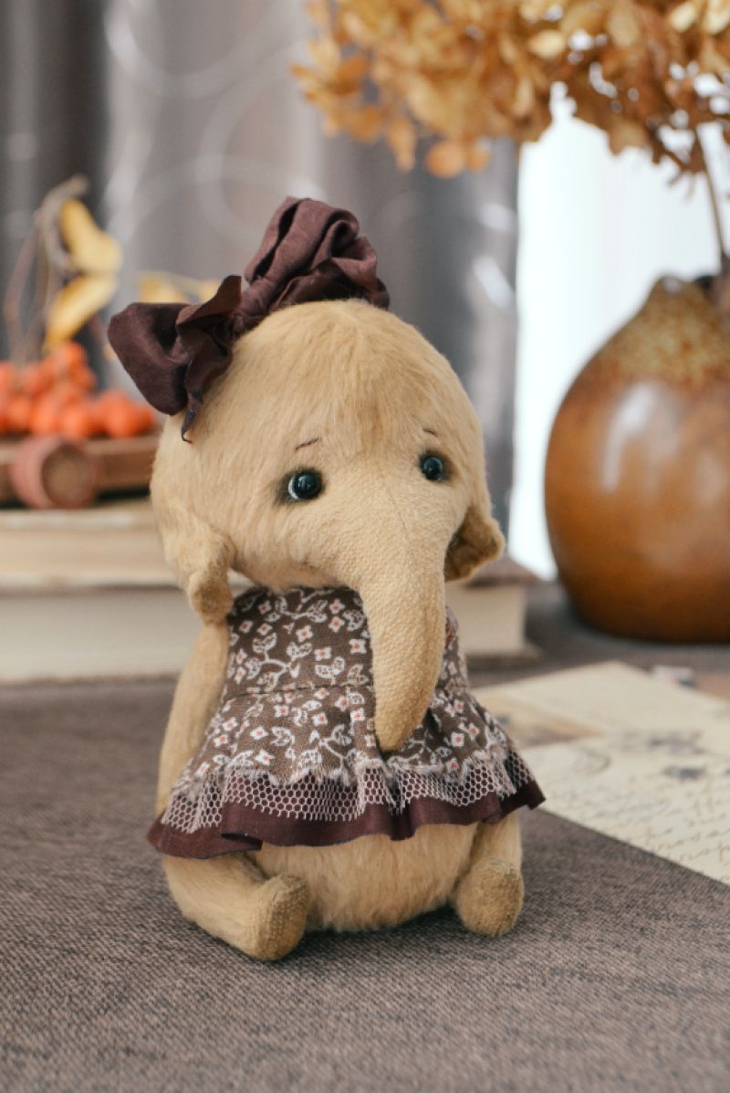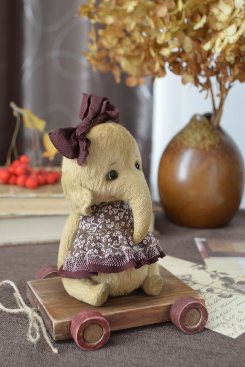Маленькая слоняша Булочка сшита в технике Тедди из немецкой вискозы. Все крепления подвижны, глазки - стекло, платье снимается. А самое главное, на неё невозможно смотреть без улыбки! (Тележка на последнем фото не продаётся)