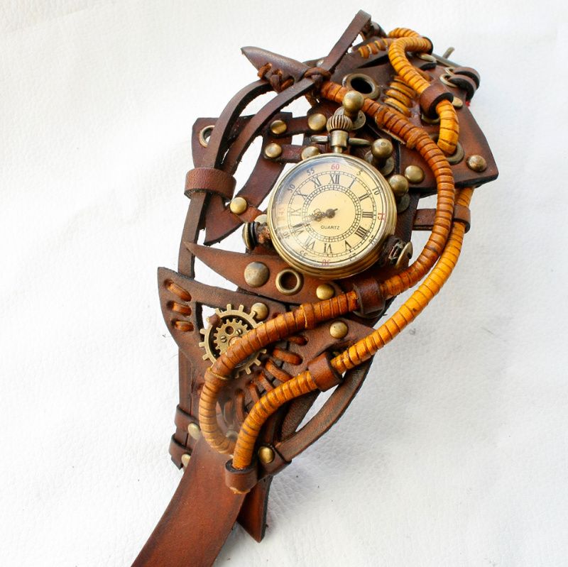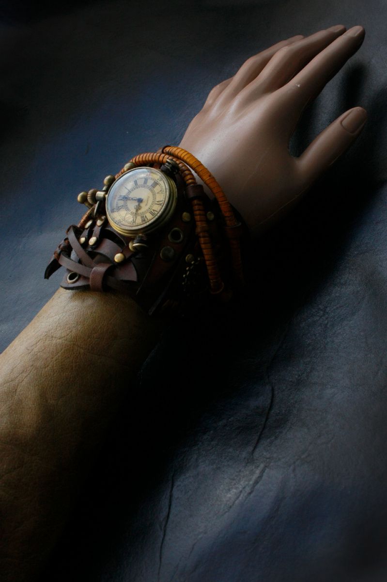 браслет из натуральной кожи с часами обхват руки 17-20см