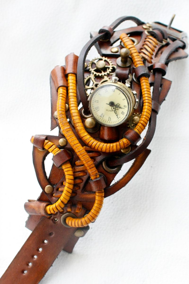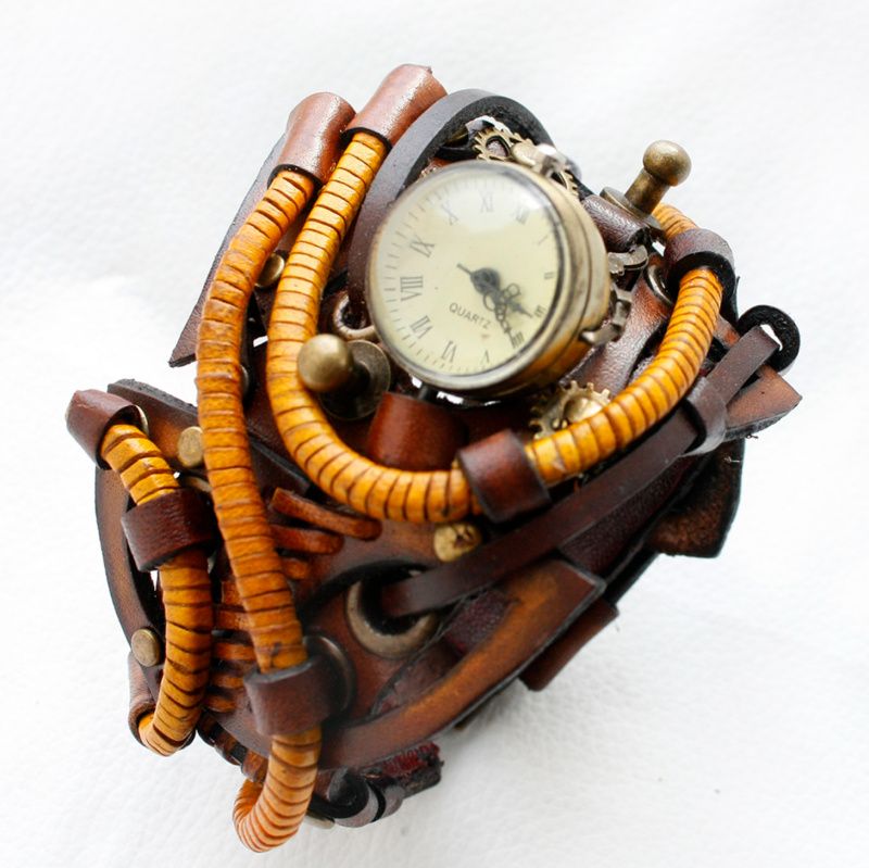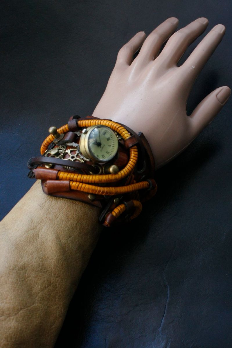 брааслет из натуральной кожи с часами стимпанк обхват руки 16-19см