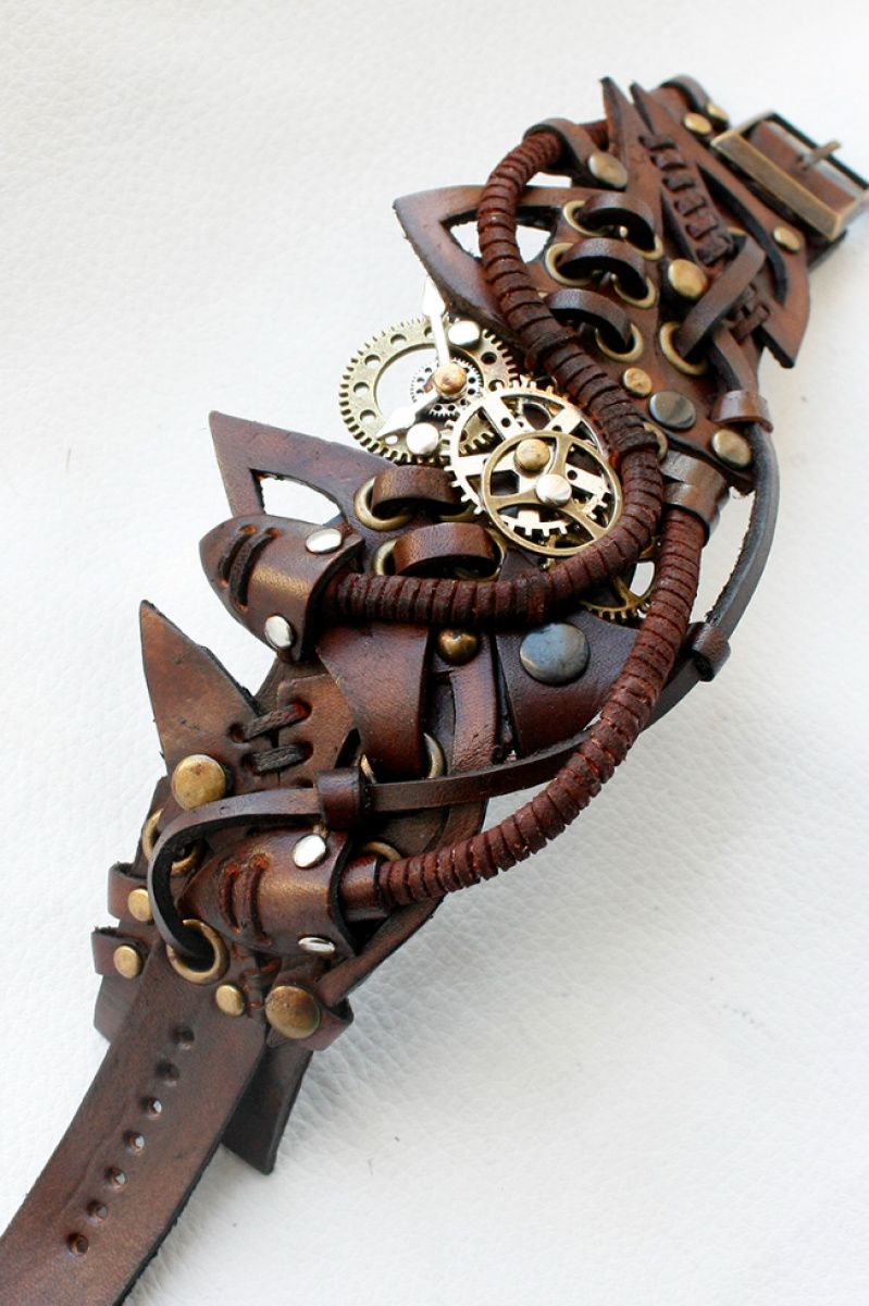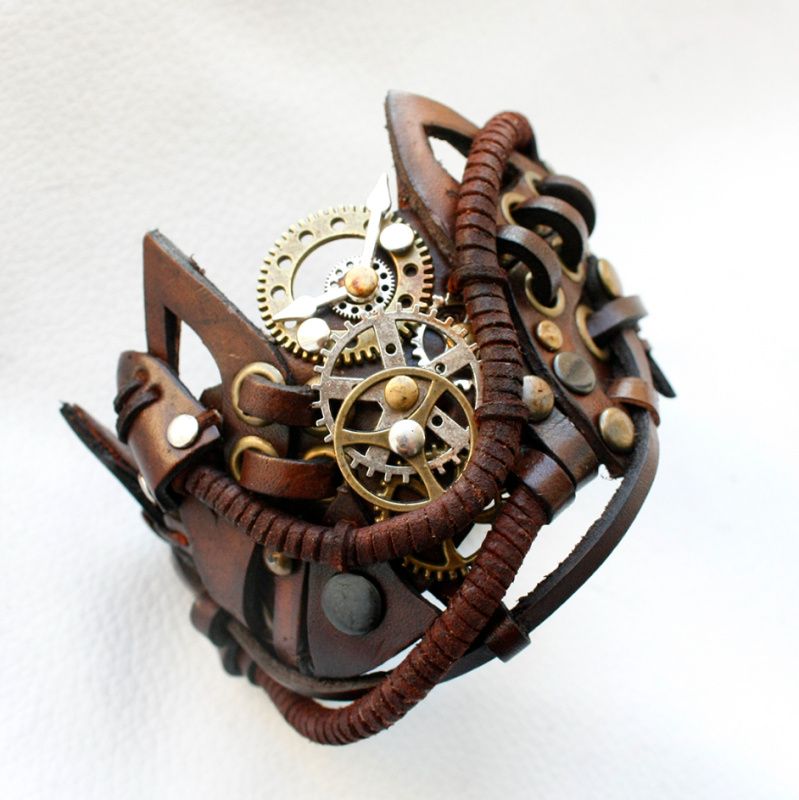 браслет в стимпанк стиле змея с часовым механизмом из натуральной кожи растительного дубления обхват руки 17-20см