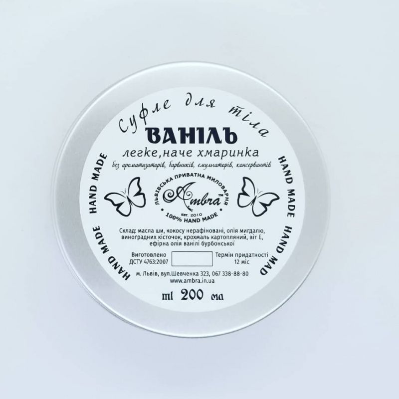 Состав масла ши, кокоса нерафинированные, масло миндаля, виноградных косточек, крахмал картофельный, вит Е, какао порошок, эфирное масло ванили бурбонской Взбитые в легкую пинусправжин нерафинированные масла благодаря наличию картофельного крахмала не оставляют жирного следа, суфле быстро всасывается, насыщая кожу всеми необходимыми кислотами и микроэлементами, обеспечивает максимальный уровень увлажнения, содержит вещества UF-фильтры. Средство экономный-хорошо распределяется по тилу.Можливе использования и для лица. Без консервантов, эмульгаторов, красителей, ароматизаторов, как и все остальное :) Рекомендуется наносить на влажную кожу. Делаем обычно изо дня в день! Объем: 200 мл Срок годности: 12 мес