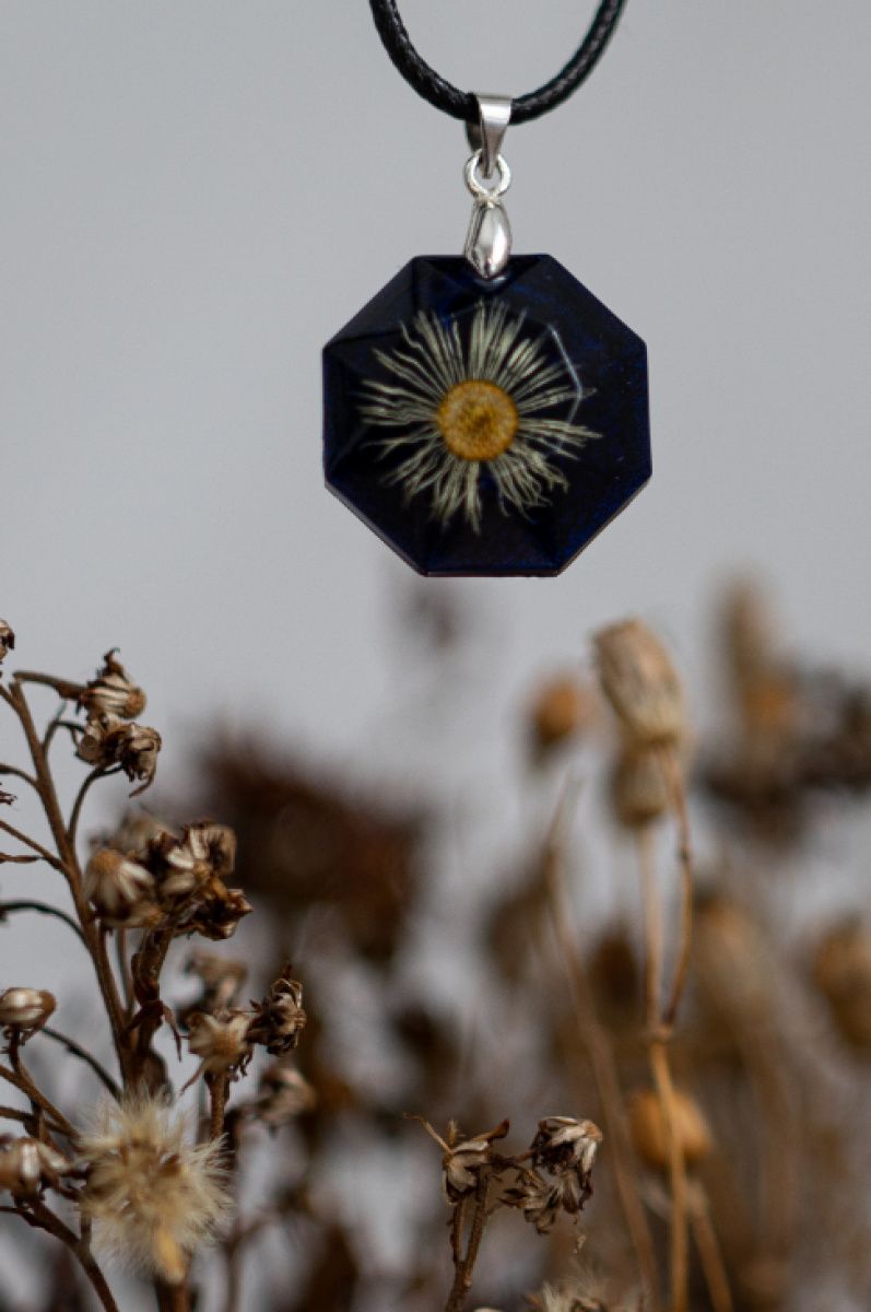 Подвеска из эпоксидной смолы с сухоцветом ромашки на черном фоне