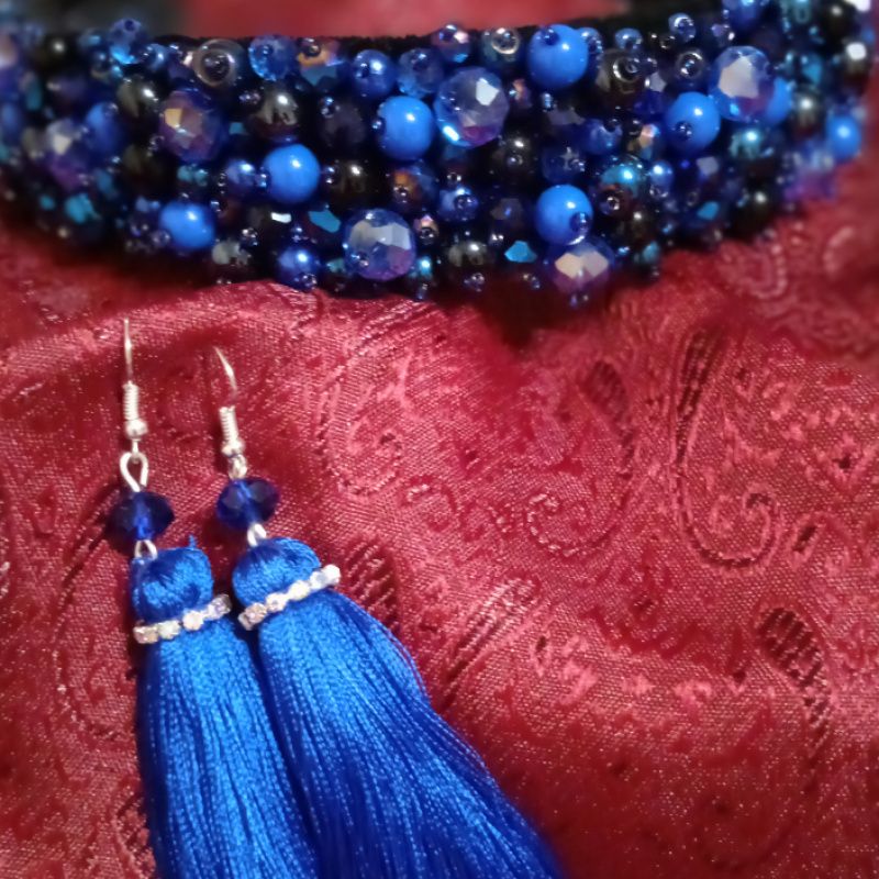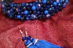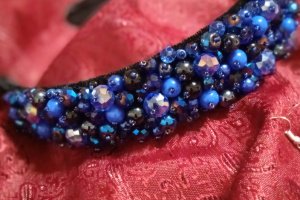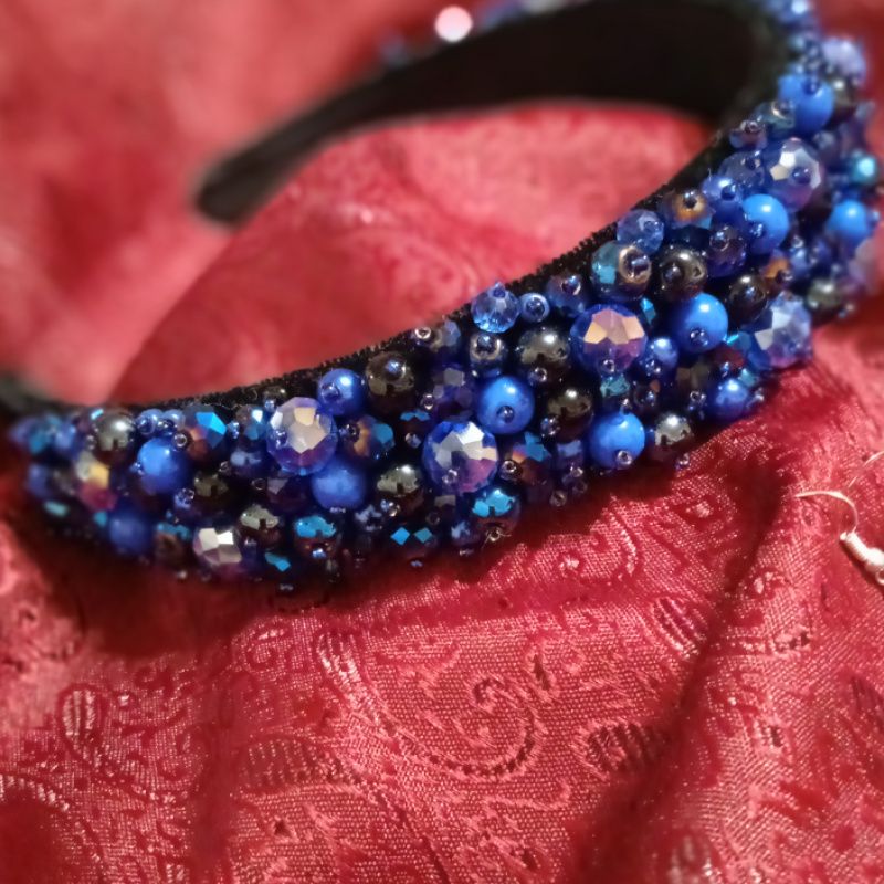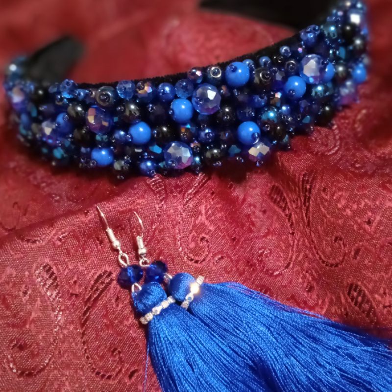 Шикарный обруч ручной работы с камнями и бусинками "Сапфир". Очень удобный и практичный. Ширина обруча 3 см, сама основа обруча обшита бархатом . К обручу в комплект идут серьги кисточки ручной роботы со стразами .