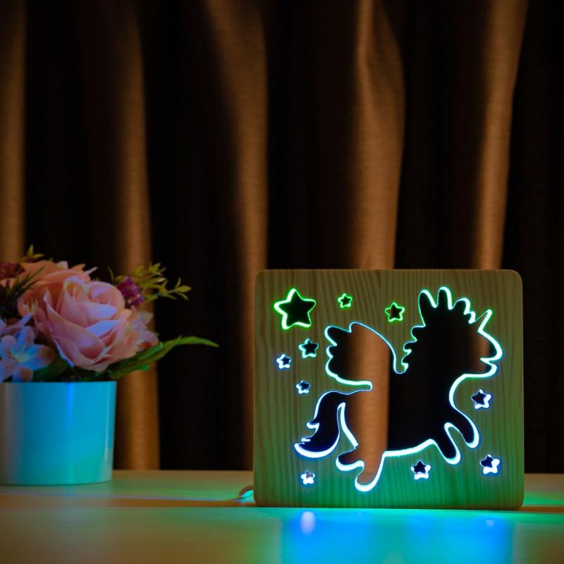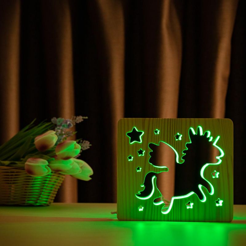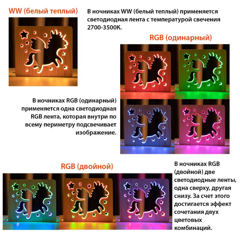 Ночник ArtEco Light LED с пультом управления - добавьте в интерьер детской комнаты свет и теплое настроение! Ищете оригинальный подарок для малыша? Предлагаем купить детский ночник, выполненный из натурального дерева. Такой светильник уместно поднять на любое торжество: именины, день святого Николая, Новый Год, Рождество, Пасха, Крестины. Ночник на пульте понравится, как мальчику, так и девочке. Также в случае того, если ваш ребенок боится темноты, купите в детскую ночник с подсветкой, и вскоре вы забудете об этой проблеме. Мягкий, не раздражающий глаза свет успокоит малыша, избавит от необоснованных страхов и поможет окунуться в беззаботный сон. Есть возможность выбрать светильник с одним из типов свечения - белый теплый (WW), RGB, RGB двойной. В ночник RGB применяется одна светодиодная RGB лента, которая изнутри по всему периметру подсвечивает изображение. А в RGB двойном две светодиодные ленты, одна сверху, другая снизу. За счет этого достигается эффект сочетания двух цветовых комбинаций. Выбирая подходящий вариант, обязательно учитывайте: - возраст и пол ребенка; - особенности интерьера комнаты; - преимущества малыша; - функционал светильника. Деревянные светильники ArtEco Light с led подсветкой подходят не только для детей, но и для тех, кто любит украшать интерьер оригинальными предметами. В нашем интернет-магазине представлены различные модели деревянных светильников. Выбрать ночник для детской гораздо сложнее, чем обычный светильник. Это объясняется тем, что осветительные приборы для детей должны отвечать ряду требований: 1. Экологичность, которая обеспечивается использованием натуральных производственных материалов. Товар поставляется в прочной коробке из эко картона. 2. Безопасность эксплуатации за счет применения led технологий, рассчитанных на работу при низком напряжении, что исключает риск поражения током. 3. Визуальная привлекательность-ночник должен нравиться ребенку и гармонично вписываться в обстановку комнаты. 4. Простота управления, позволяет легко включать и выключать свет, а также регулировать интенсивность освещения. 5. Отсутствие мерцания, оказывает негативное влияние на зрение. 6. Низкое потребление электричества светильником обеспечивается применением светодиодной ленты в качестве источника света. Так светильник можно оставлять включенным на всю ночь и не думать о счетах за электроэнергию. КОМПЛЕКТАЦИЯ - светильник из натурального дерева ArtEco Light; - адаптер для подключения к сети 220В с проводом 210 см длиной и ИК LED контроллером; - дистанционный пульт управления с батарейкой типа CR2025; - инструкция.