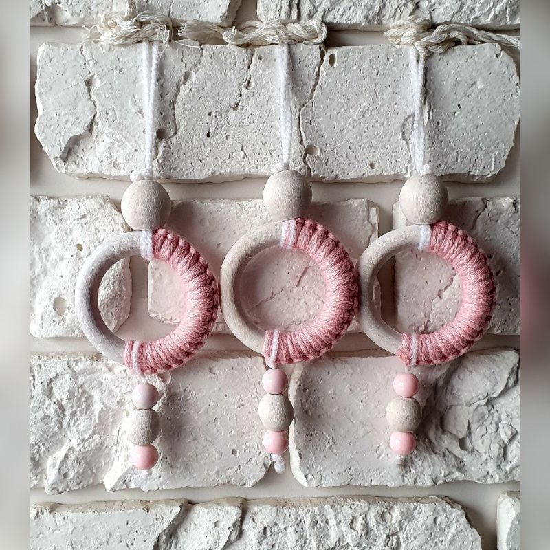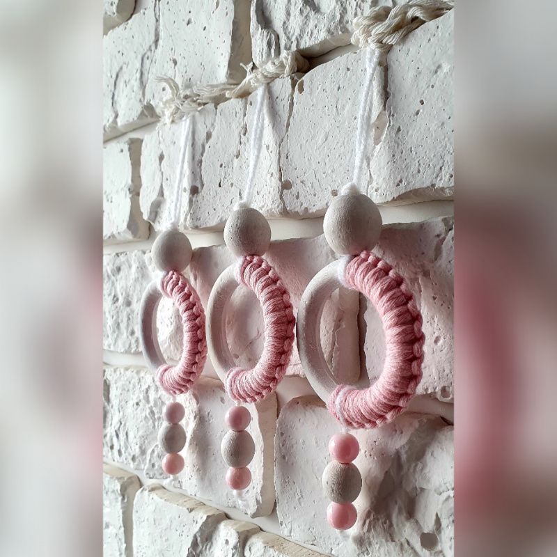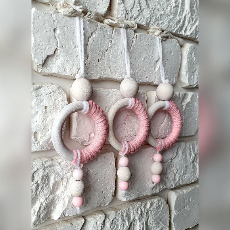 Бело-розовые новогодние колечки для украшения ёлочки с деревянными и стеклянными бусинами
