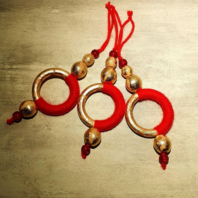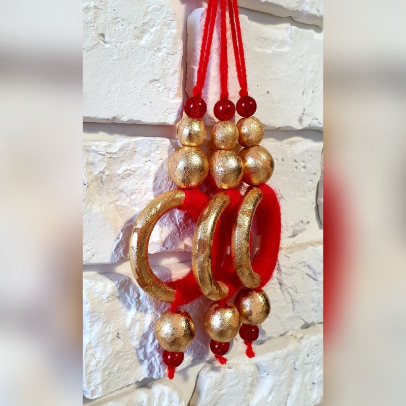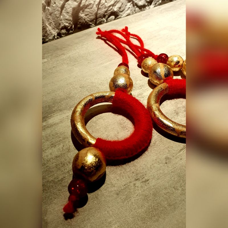 Красивые и яркие новогодние украшения красные колечки с позолотой и стеклянными бусинами