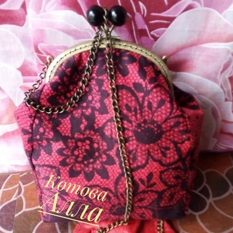 Сумочка из ткани на застежке фермуар.Дно имеет 4 ножки, подклад с карманом.Ручка-цепочка 60 см.