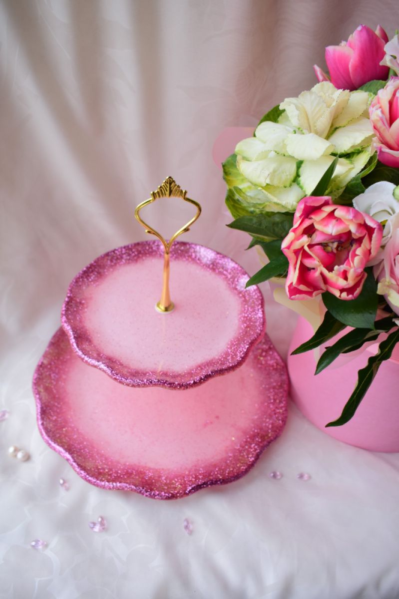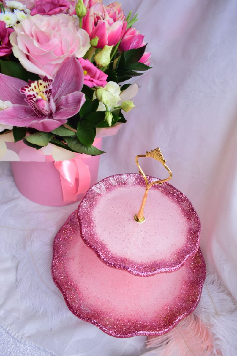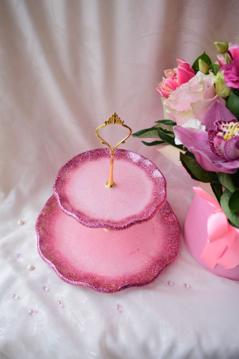 Уникальная ручная работа с ювелирной смолы. Замечательный вариант на свадьбу, вечеринку, фуршет и любые другие праздники. Прекрасный, достойный и нестандартный подарок человеку любого пола и статуса. Элегантная, с легким блеском, она станет невероятной украшением стола, эффект WOW для Ваших гостей))) Можно сервировать фрукты, десерты, закуски, или использовать для презентации украшений, духов, часов и как элемент декора. Есть и в других цветах. Также это практичная и красивая вещь для всей семьи. Вы можете просто поставить его на кухне и это станет любимым элементом Вашего стола, там всегда могут лежать любимые конфеты, фрукты и другие лакомства) Дети будут в восторге! Сделаем любой цвет на заказ, чтобы подчеркнуть именно Ваш интерьер. Может быть так же прозрачной или полупрозрачной даже с перьями или лепестками роз внутри) Время изготовления 2-3 дня Качественная смола для ювелирных изделий абсолютно безопасна даже при прямом контакте с пищей. Также использованы следующие материалы: золотая поталь, розовый глиттер, перламутровая пудра, краски, металлическая фурнитура. Красивый цвет фурнитуры -золото, высота изделия 26, ширина нижнего яруса 25 см. Также в наличии 3-х ярусные этажерки. Подчеркнет интерьер и подарит праздничное настроение! Может быть выполнено в любом цвете на Ваш вкус. Изготавливаем другой декор, блокноты, украшения, товары для дома и многое другое) Доставка Новой почтой по предоплате или минимальной 100грн. Возможен самовывоз Киев. Сделано с любовью)