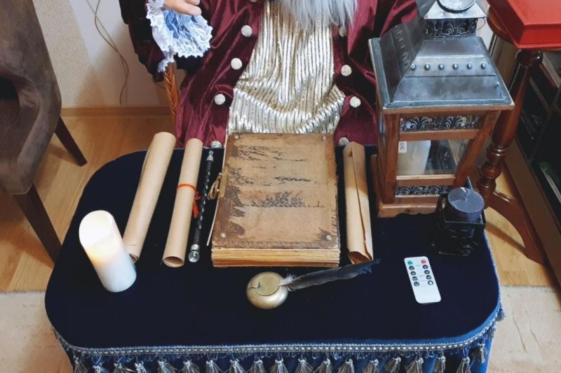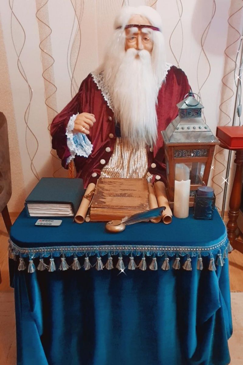 В комплект входит: Фатах, его кресло с подушкой, столик перед ним, 2 электро свечи (одна в фонаре), обложка старинной книги, чернильница с пером.