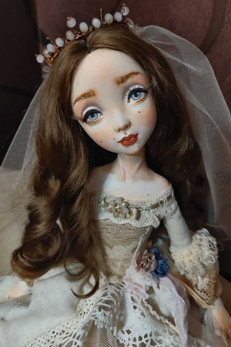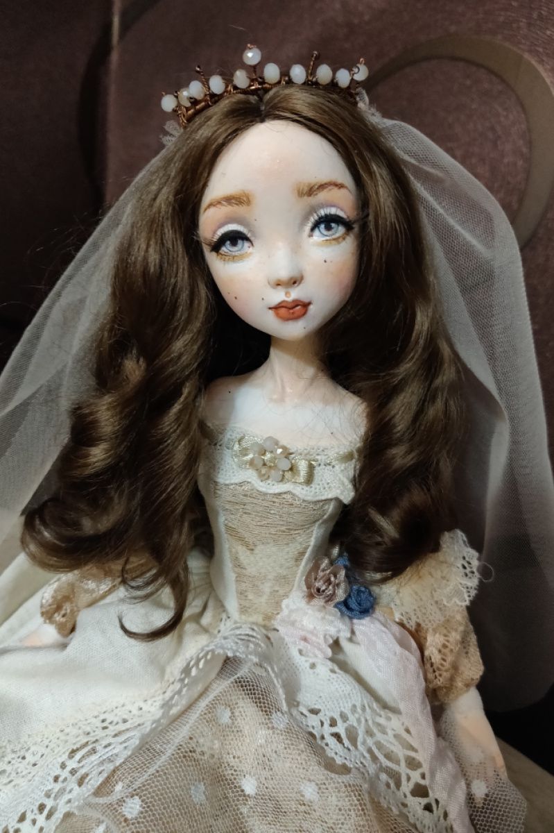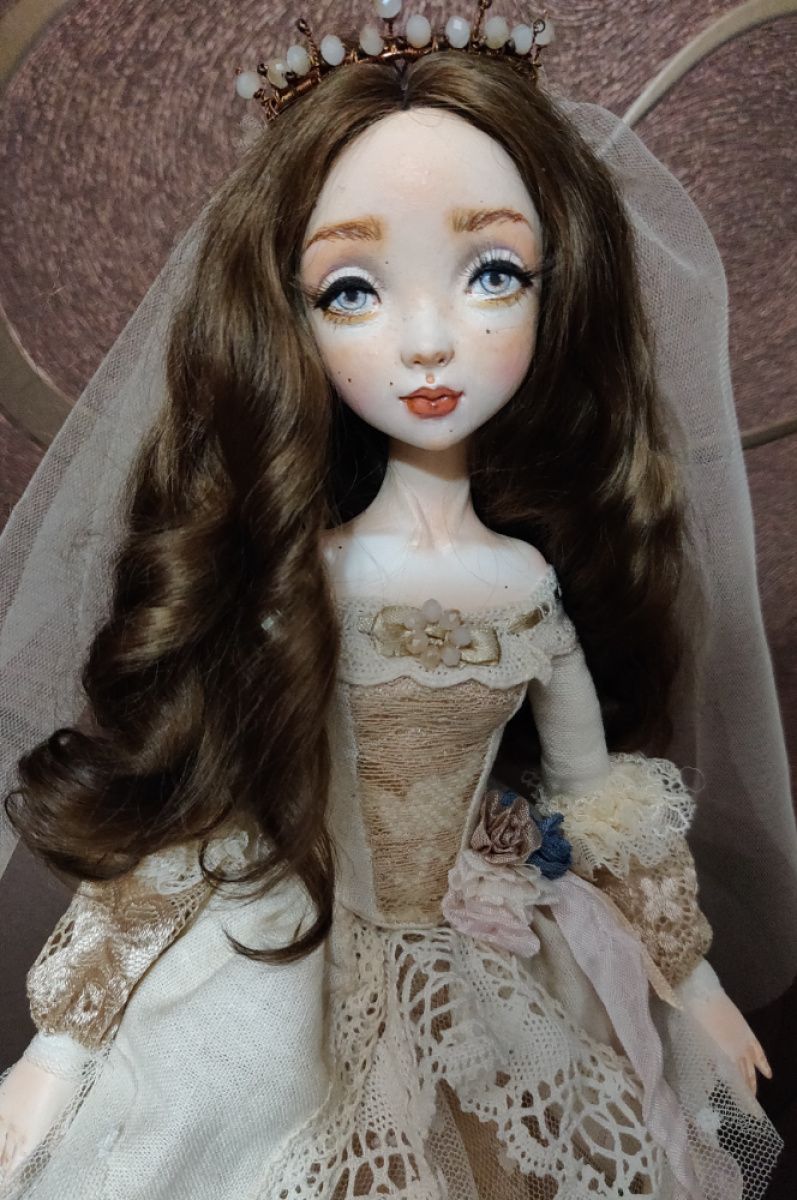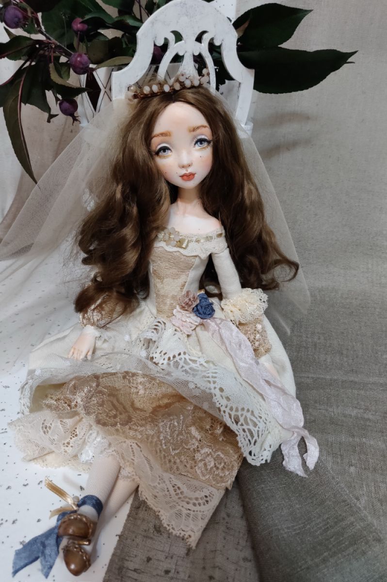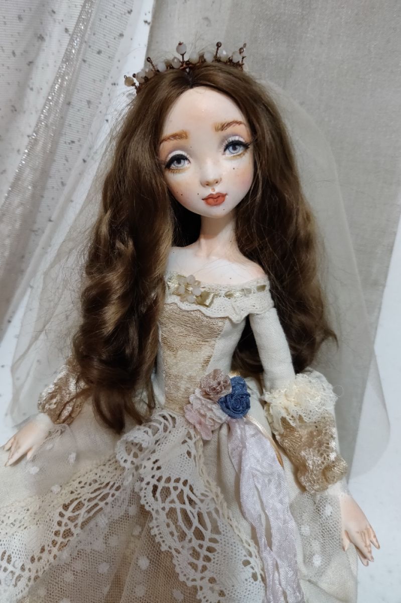Кукла подвижна. Сидит самостоятельно. Выполнена из флюмо, тело – текстильное. Пуговичное крепление в бедрах.В коленях бусины. Голова на шарнирном соединении, поворачивается.
