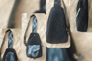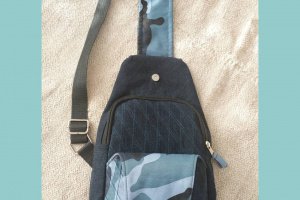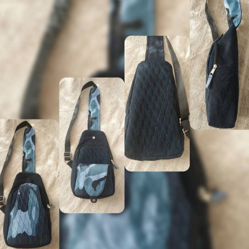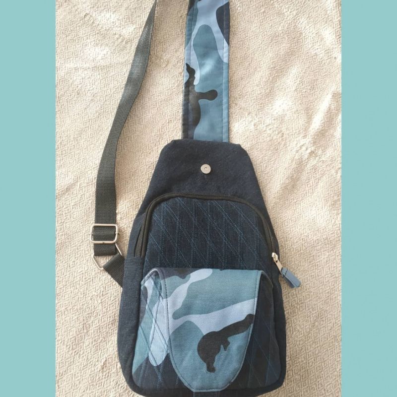 Однолямочный рюкзак, сумка-слинг. Сумочка сшита из джинсовой ткани тёмно-синего цвета со стежкой нитками в тон камуфляжной сумочной ткани, которую использовала для отделки. Со временем джинс станет светлее и сумочка будет смотреться иначе. Размеры 33*17*7. Закрывается на молнию и магнитную кнопку. Внутри два открытых кармана.