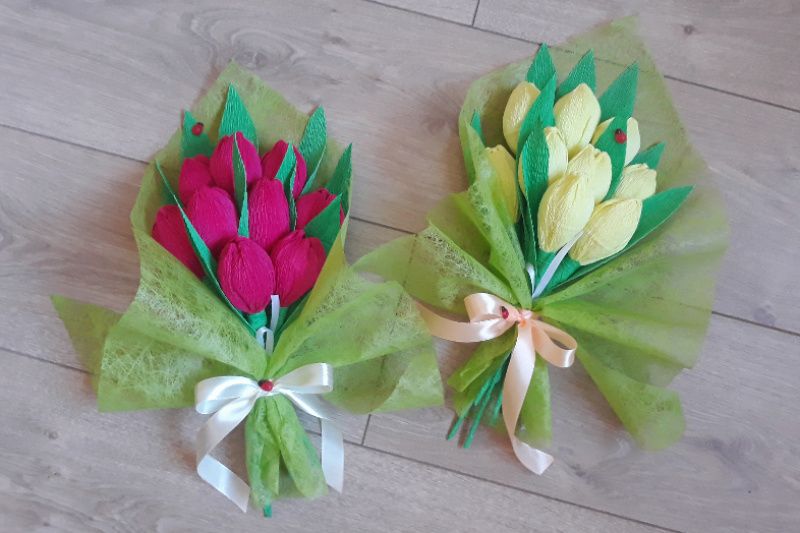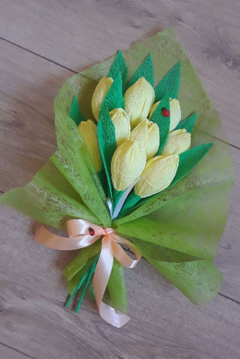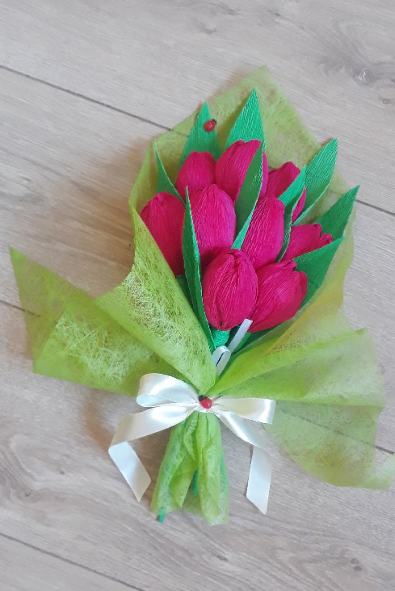 Букет из 9 шт. Внутри цветов конфеты (можно заказать конкретные конфеты). На фото тюльпаны цвета фуксии и лимонного цвета (можно смиксовать).