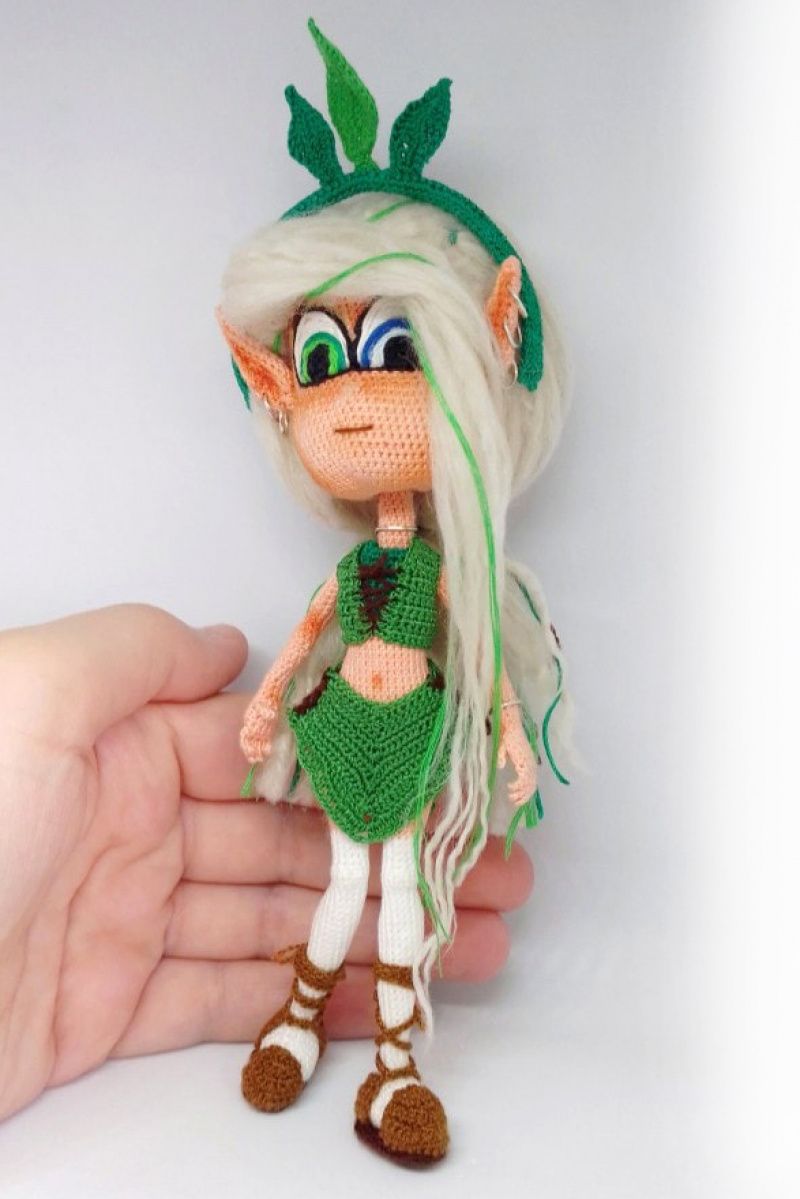Коллекционная интерьерная кукла лесная эльфийка, фея. Рост 16 см. Связана крючком из хлопчатобумажной пряжи. Тонированная пастелью. Внутри проволочный каркас. Можно делать разные прически. Одежда снимается.