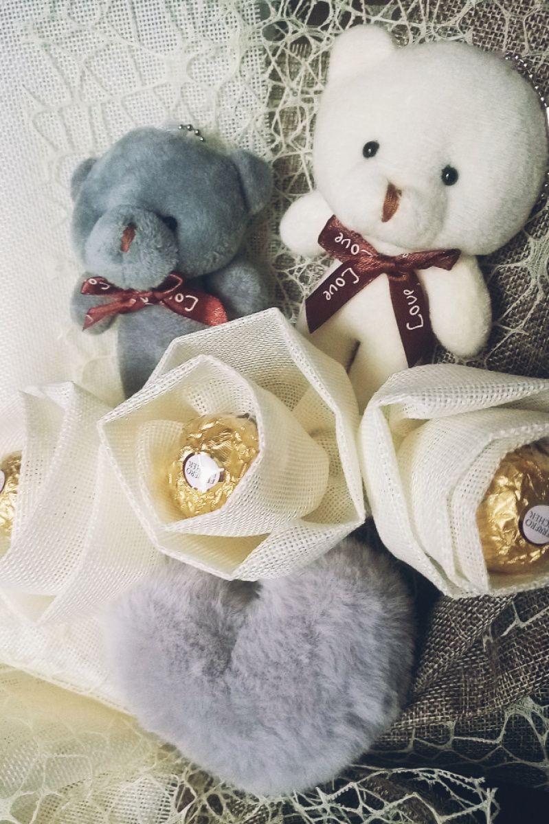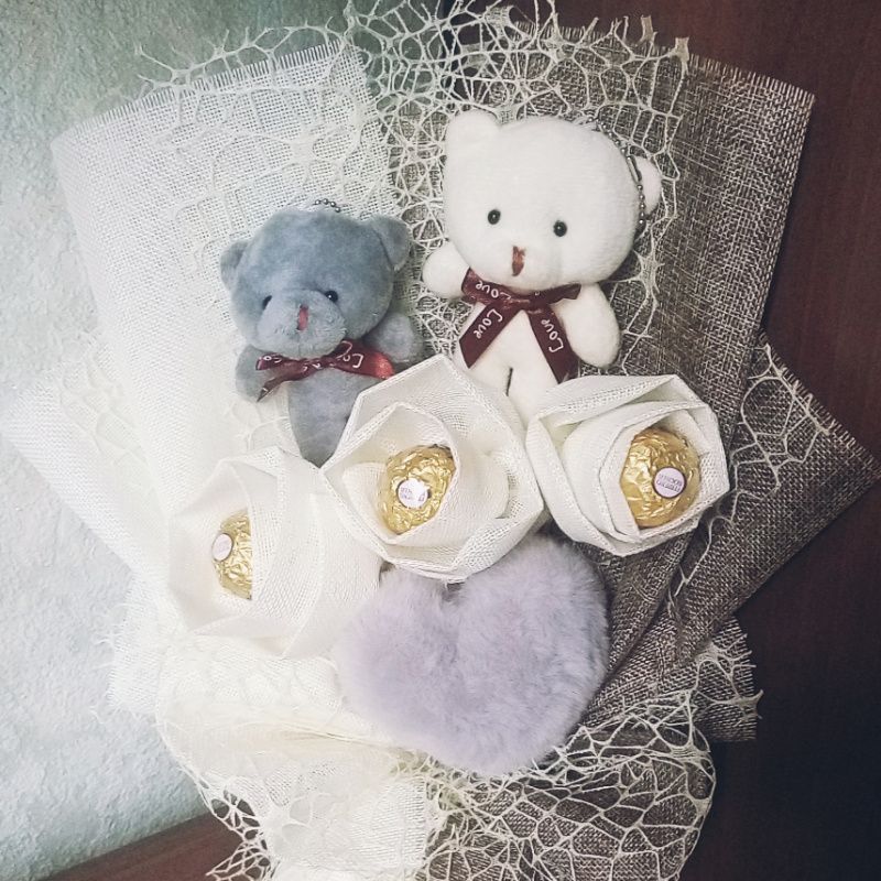 Высота букета 45см, ширина 32см, толщина 12см. Наполнение 3 конфеты фереро роше, 3 мягкие игрушки-брелки Завернутый в декоративную мешковину