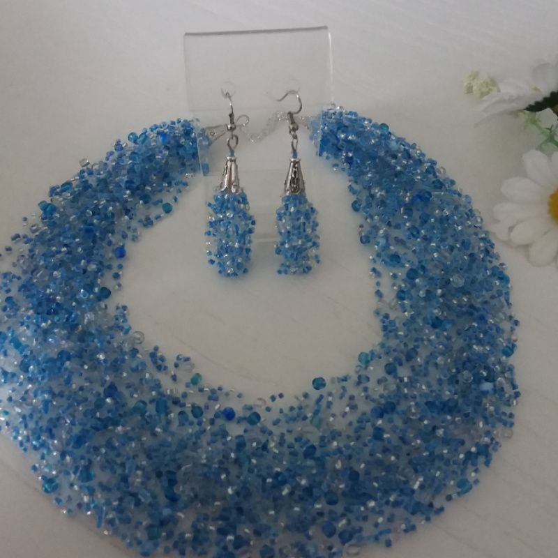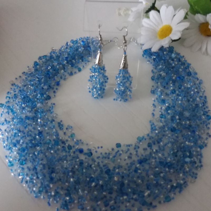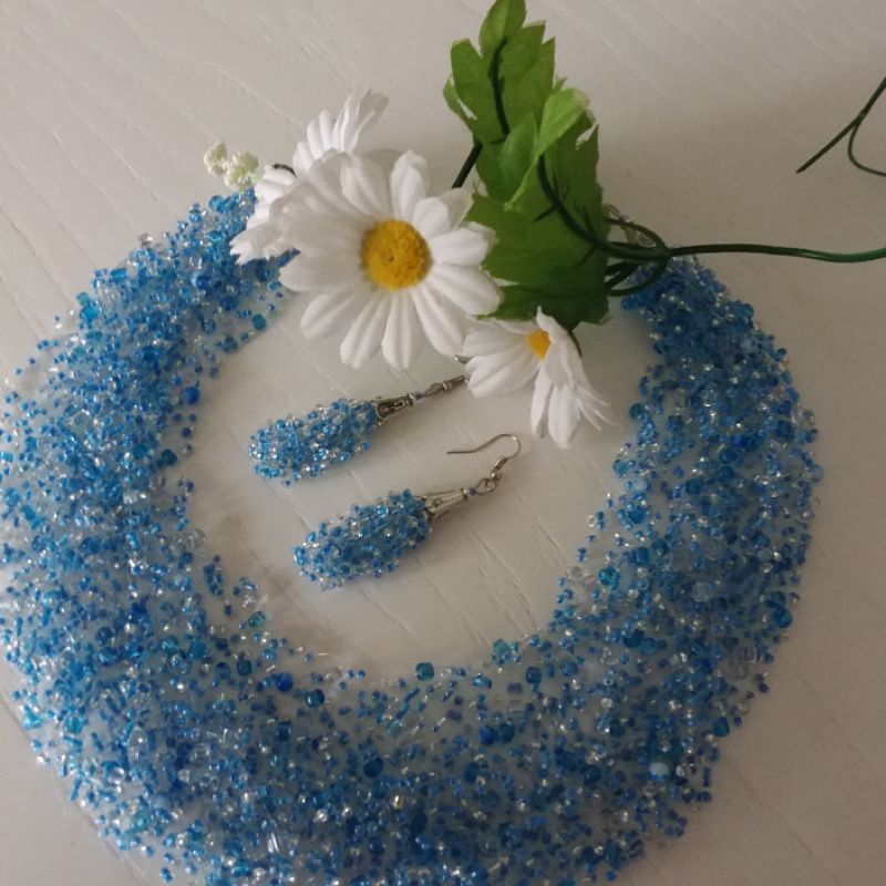 Воздушное колье изготовлено из синего, прозрачного, зеркального бисера разного размера и мраморных бусин в цвет бисера. Сочетание этих нежных цветов, особенно вкрапления зеркального бисера, привлекает взгляд, придает уверенность и нежное очарование. Длина колье 46 см, имеется цепочка-удлинение. Дополнительно заказывайте серьги, довершайте образ, не пожалеете, так утверждают заказчики!