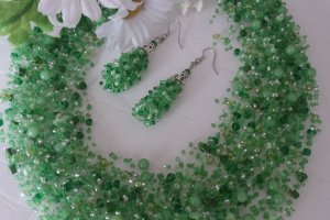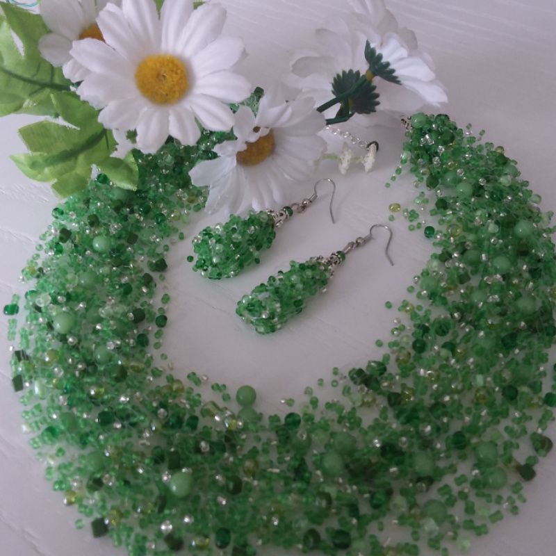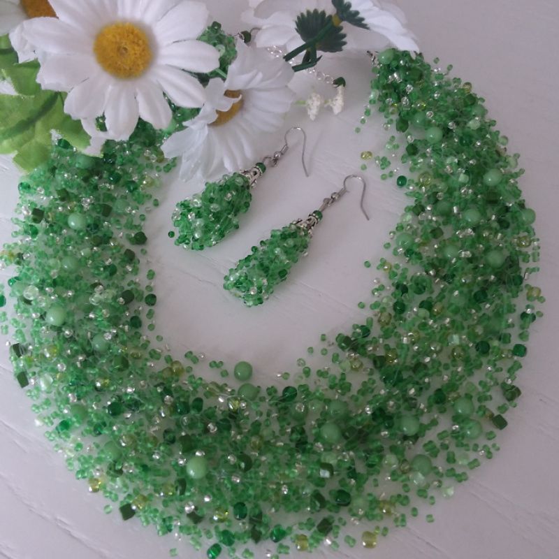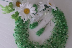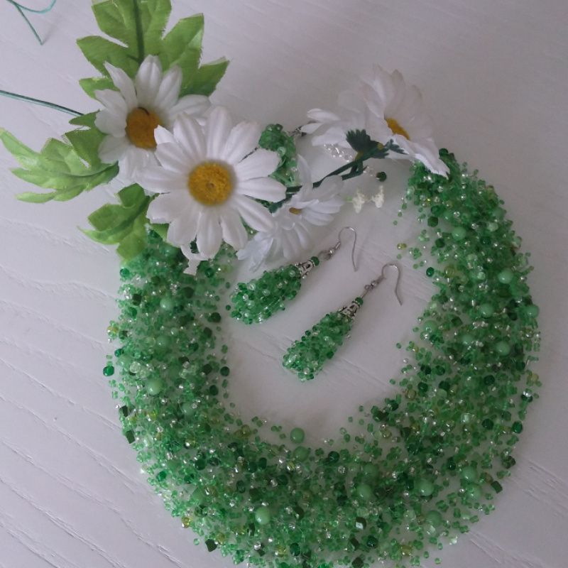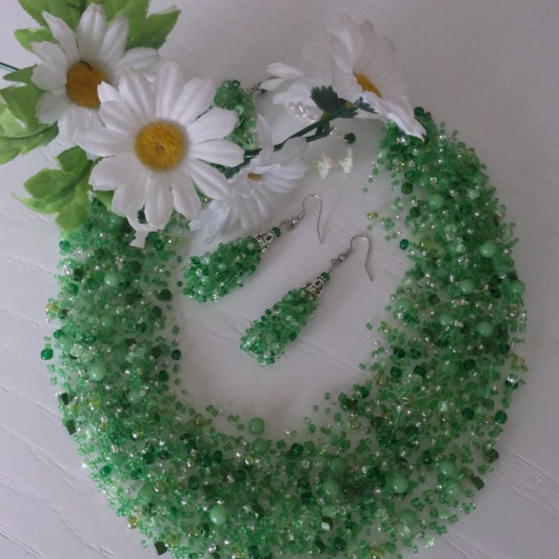 Нежная, и в то же время яркое, воздушное колье изготовлено из различных тонов зеленого и серебристого бисера разного размера. Длина колье 46 см, есть цепочка-удлинения. Есть возможность дополнительно заказать серьги и браслет. Покупайте и носите с удовольствием!