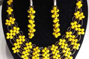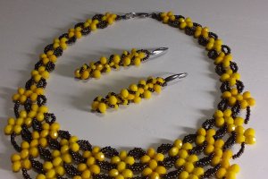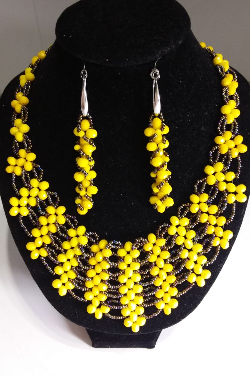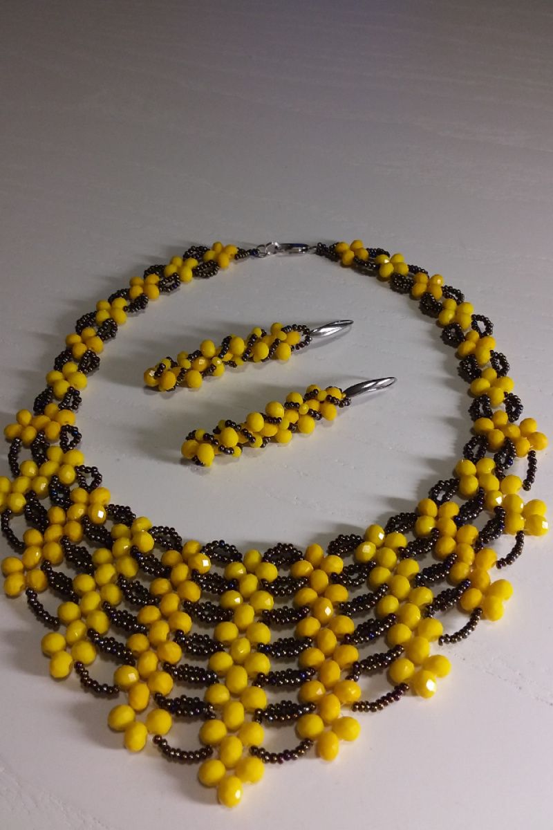 Яркое, нарядное колье изготовлено с желтых бусин и чешского мерцающего бисера. Длина колье 46 см, есть цепочка-удлинение. Можно заказать любой размер. Дополнительно можно заказать серьги. Приобретайте и носите с удовольствием!