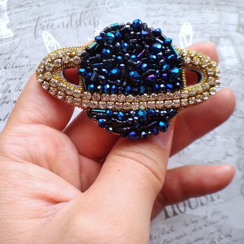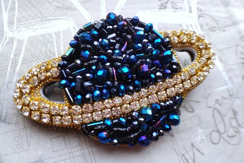 В работе использованы биконусы,стразовая цепь, канитель,чешский бисер,стеклярус,обратная сторона-замша, булавка с поворотным механизмом.