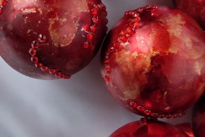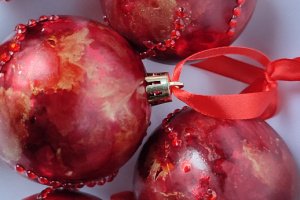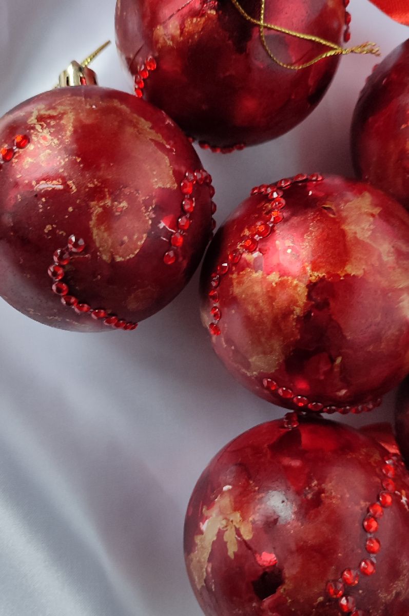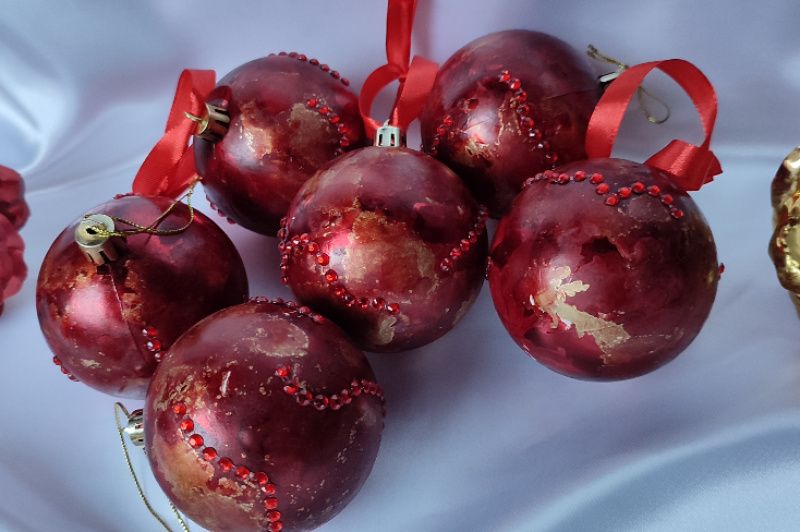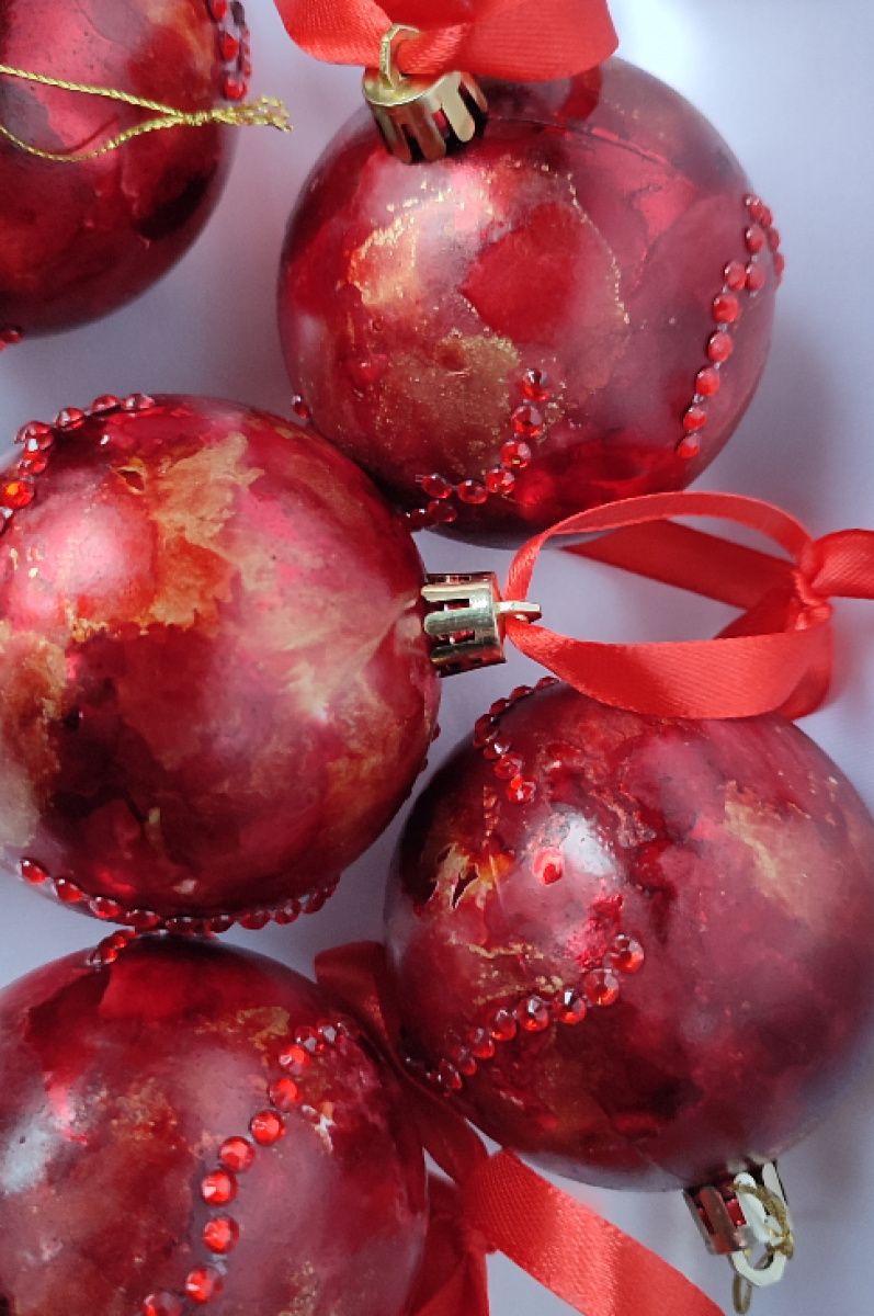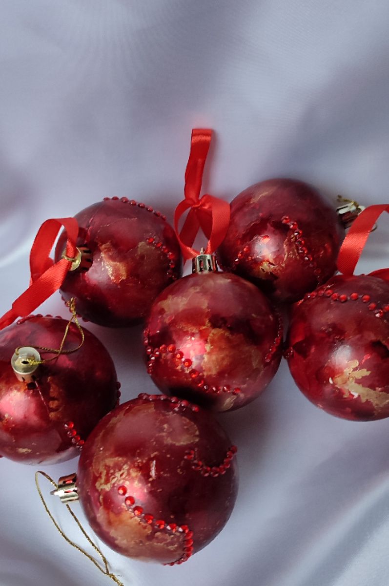 Набор из 6 елочных шаров расписаны спиртовыми чернилами и украшены стразами.