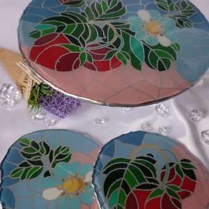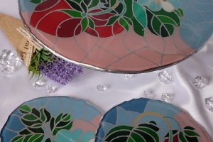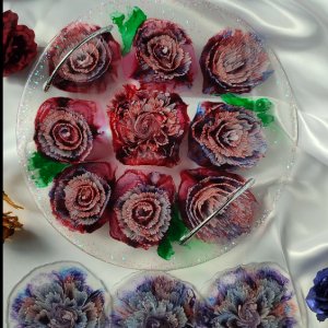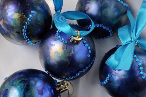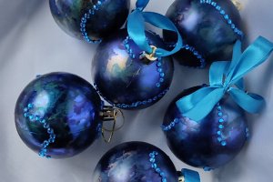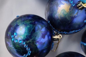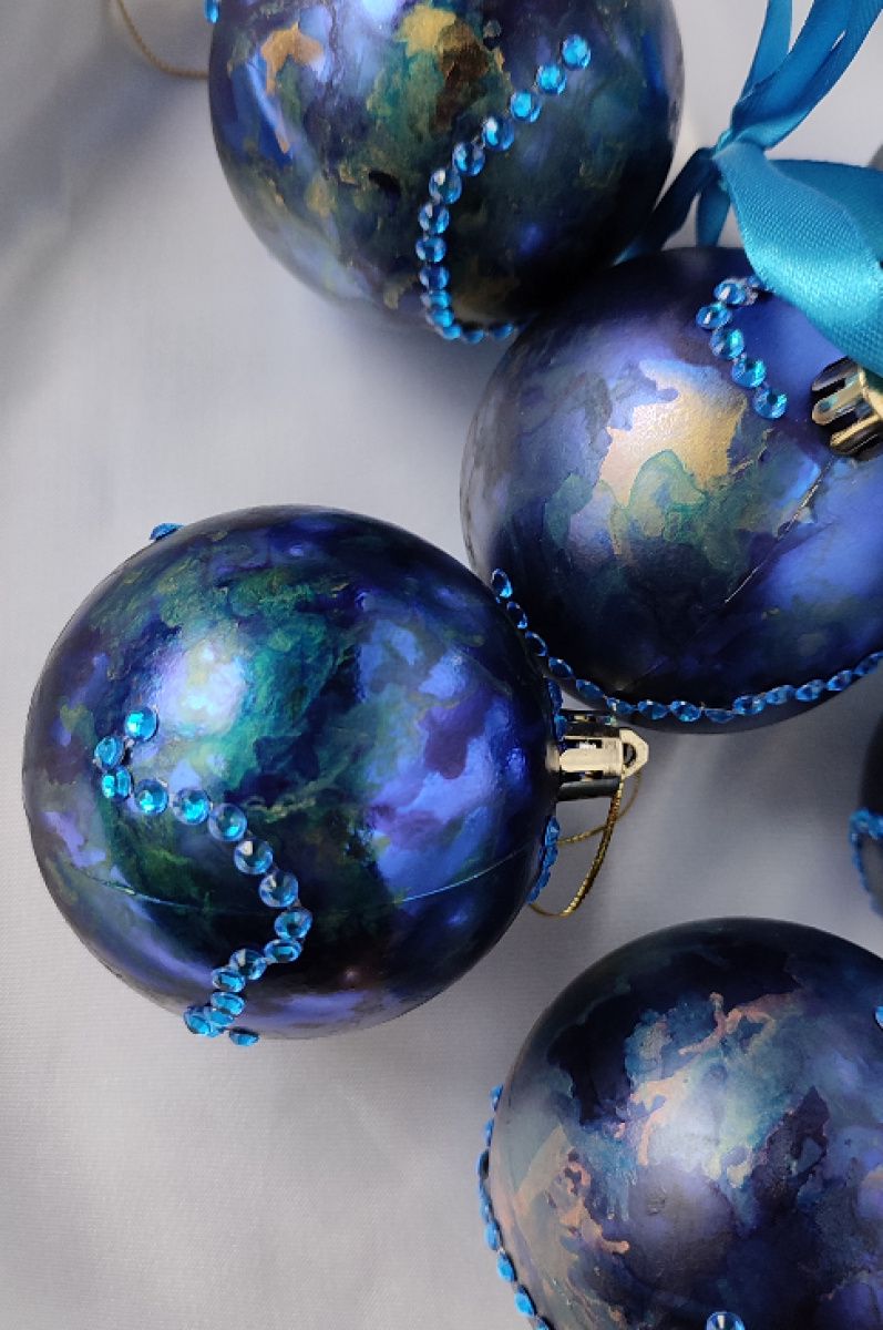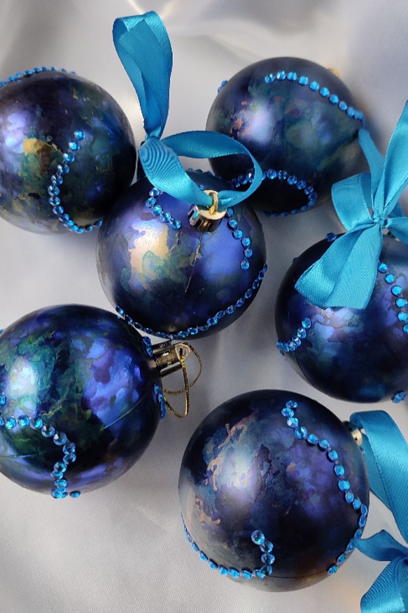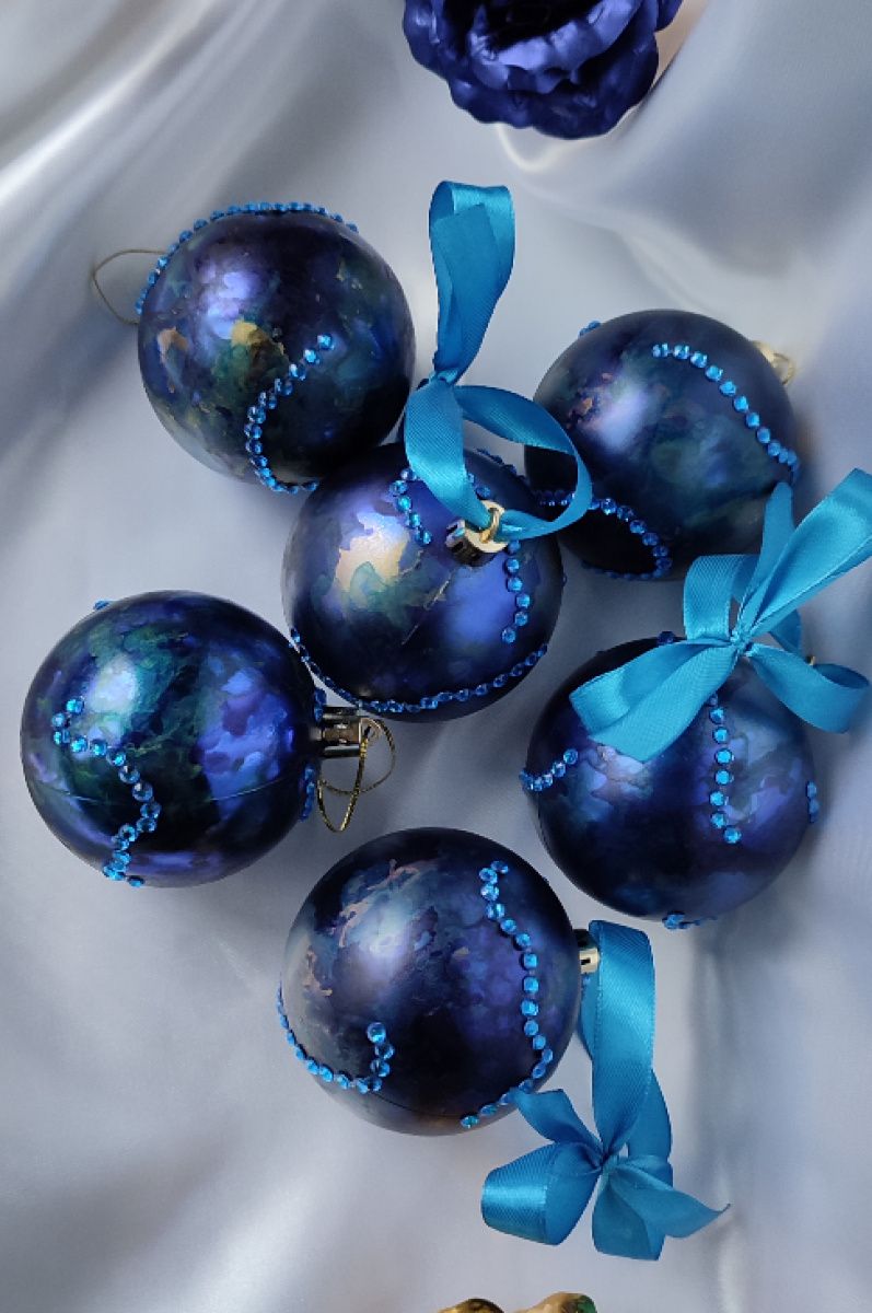 Набор из 6 елочных шаров расписаны спиртовыми чернилами и украшены стразами.