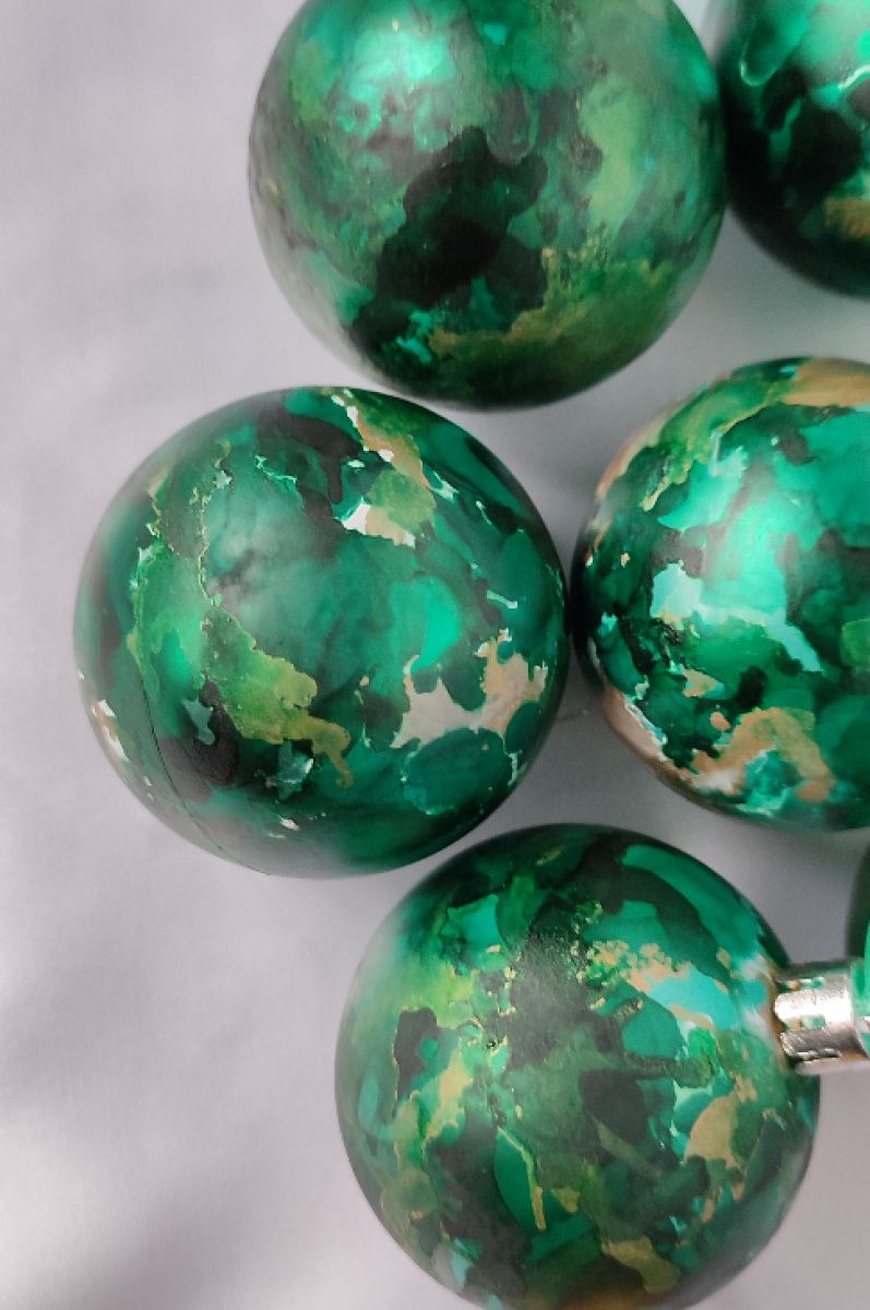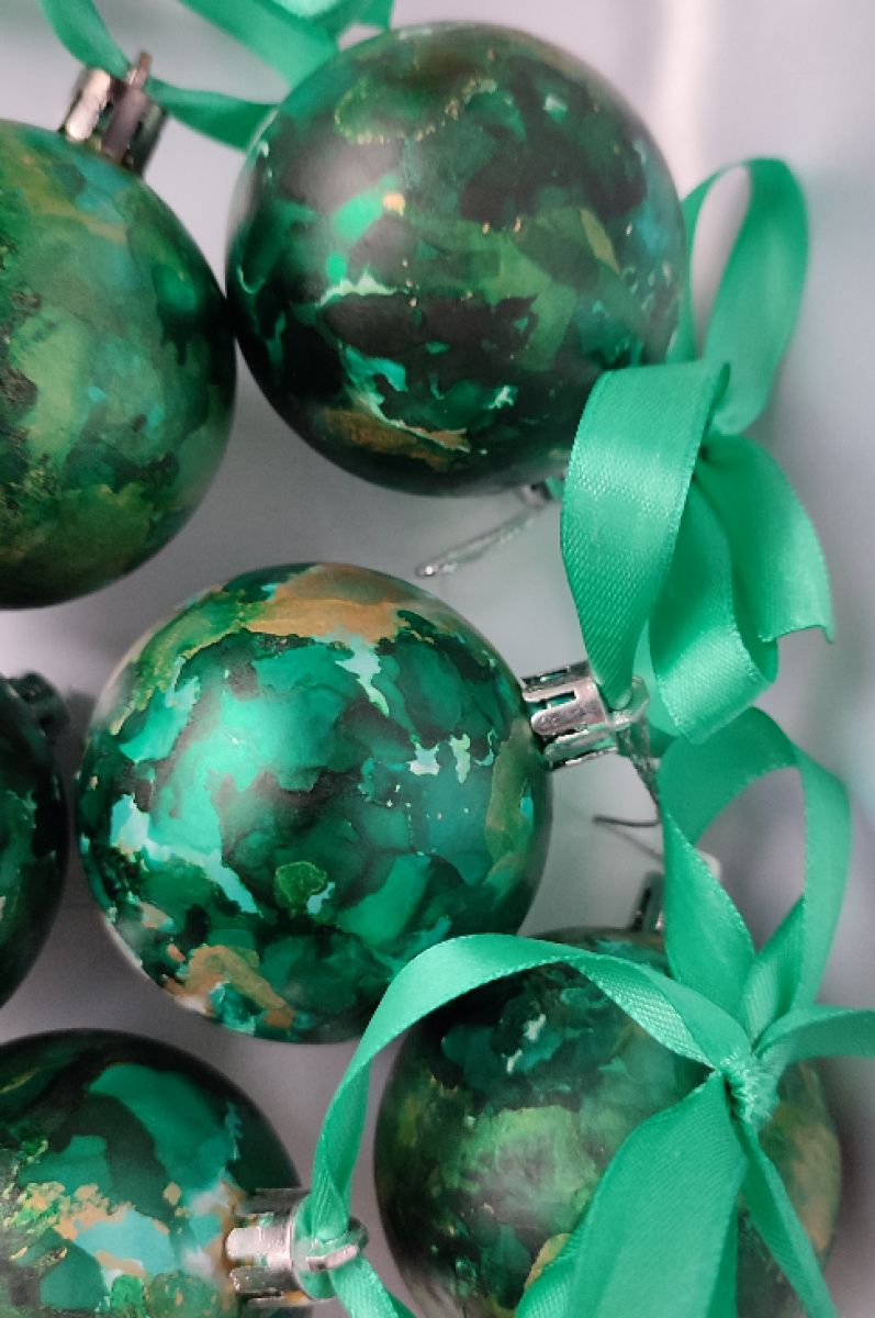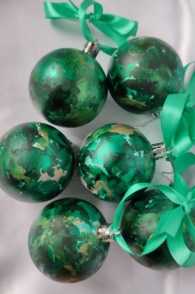 Набор из 6 елочных шаров расписаны спиртовыми чернилами и украшены стразами.