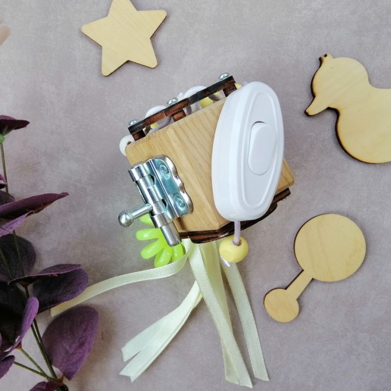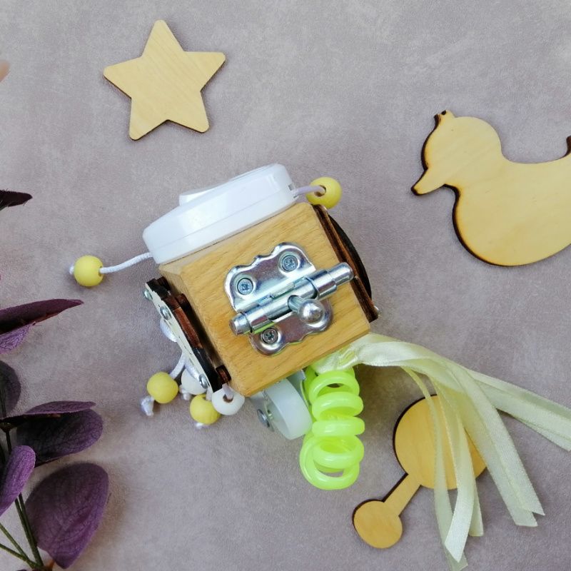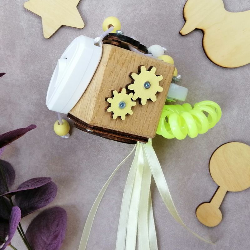 Безопасная развивающая игрушка в виде кубика. На всех сторонах размещены увлекательные элементы, способные занять вашего малыша и развивать мелкую моторику, логику и воображение! • Одним из основных преимуществ является размер 5х5 см, компактный размер, который удобно держать маленькими ручками! • Можно взять куда угодно! Занять малыша в машине, на прогулке, в очереди в поликлинику, на важной встрече! • Не нужно таскать с собой кучу игрушек. Отличный мини бизиборд поместится в любую сумочку! • Малыш играет - мама отдыхает! Удобная игрушка в дорогу, на прогулку, отвлечет ребенка и даст вам возможность заняться делами.