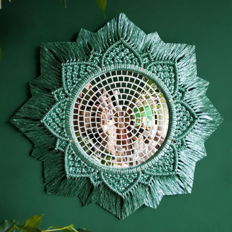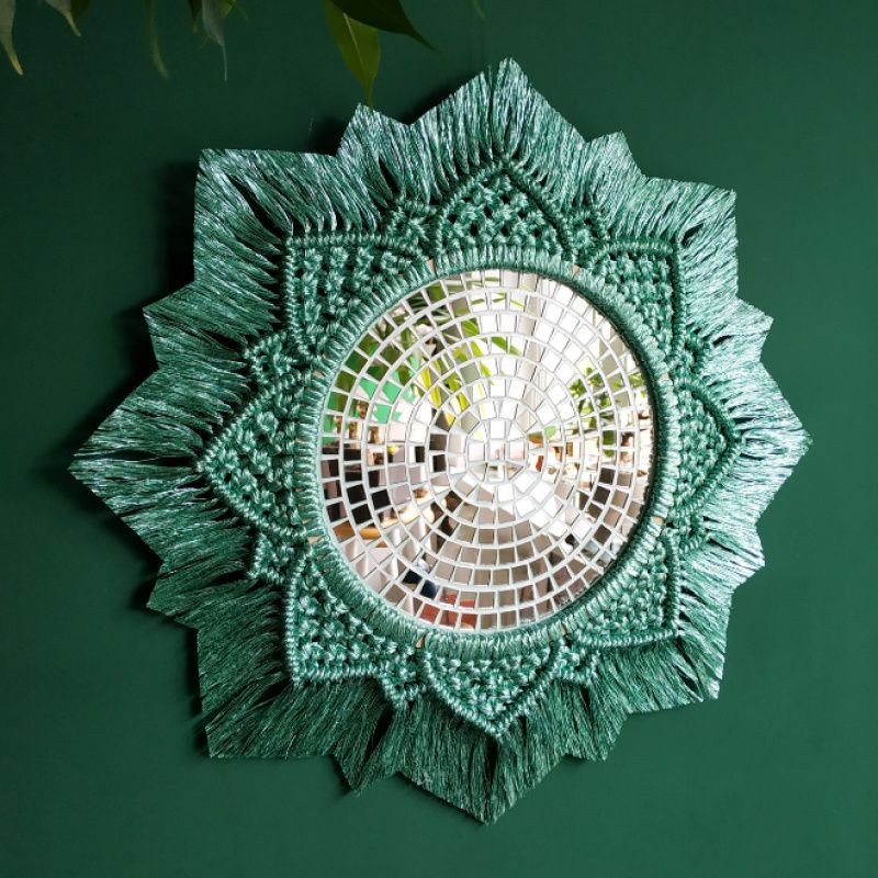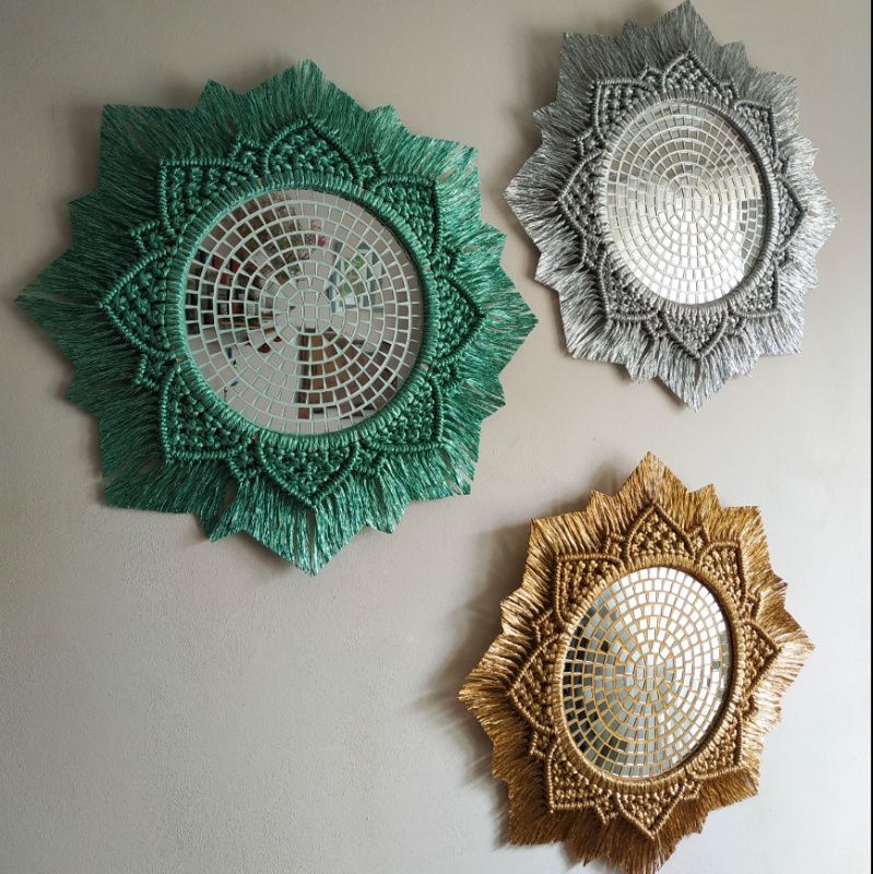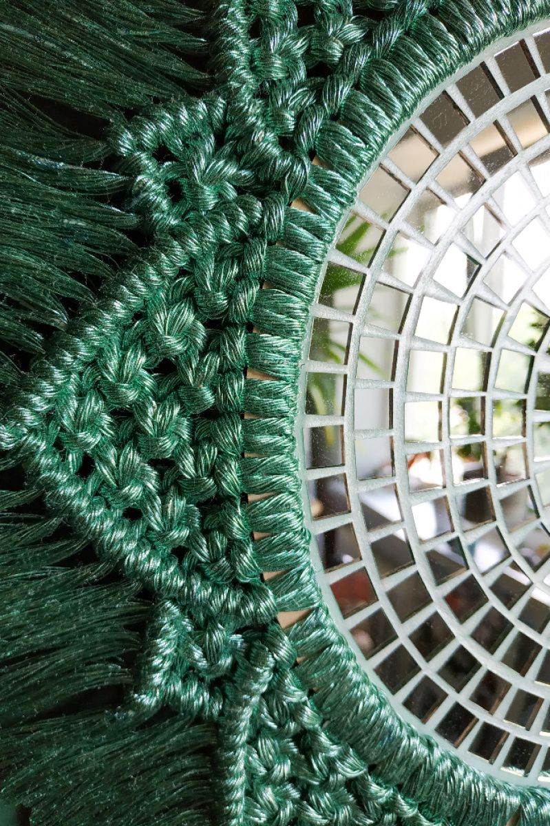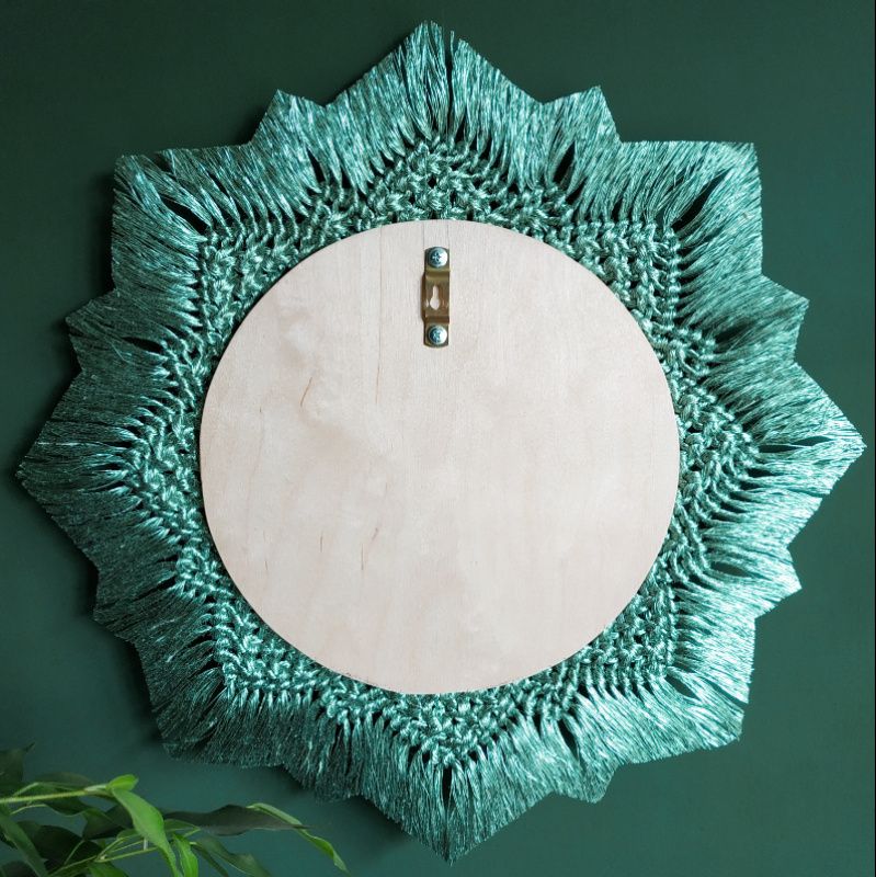 Макраме в форме солнца, с зеркальной мозаикой. Сделано вручную и с большой любовью! Эта прекрасная макраме в форме солнца изготовлена из 60% хлопка и 40% люрекса, зеркальной мозаики и дерева. Форма солнца соткана вручную. Лучи макраме на солнце покрыты специальным лаком для поддержания идеальной формы, именно переплетение может изгибаться, поэтому его всегда можно выровнять. На задней части зеркала есть крепления, чтобы его можно было легко прикрепить к стене. Выпускается в трех цветах: золотом, серебряном и бирюзовом. Мозаика, приклеенная вручную, затирка была использована для обработки мозаики. Зеркало макраме идеально подходит для гостиной, спальни, прихожей и украсят любой интерьер дома. Это современное настенное зеркало станет прекрасным украшением для любого уголка вашей спальни или дома. Каждый изделие изготовлено мной вручную, что делает его уникальным. Поэтому каждый из них может отличаться.