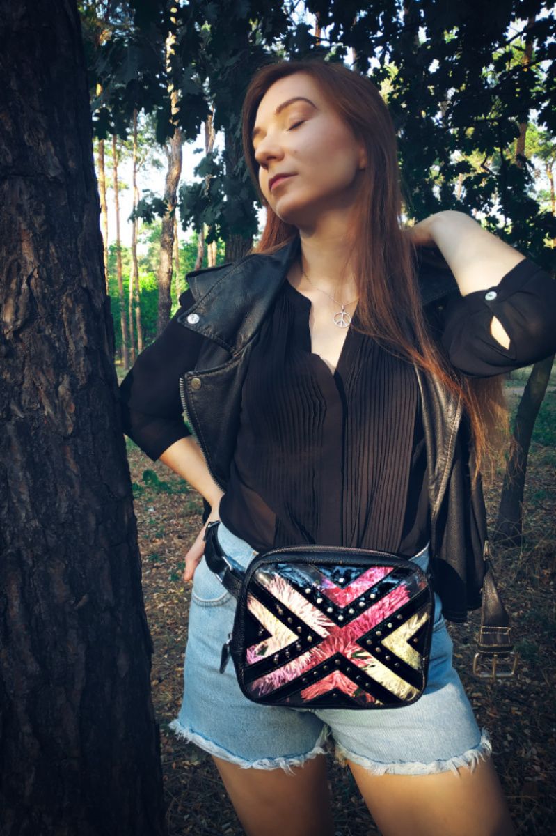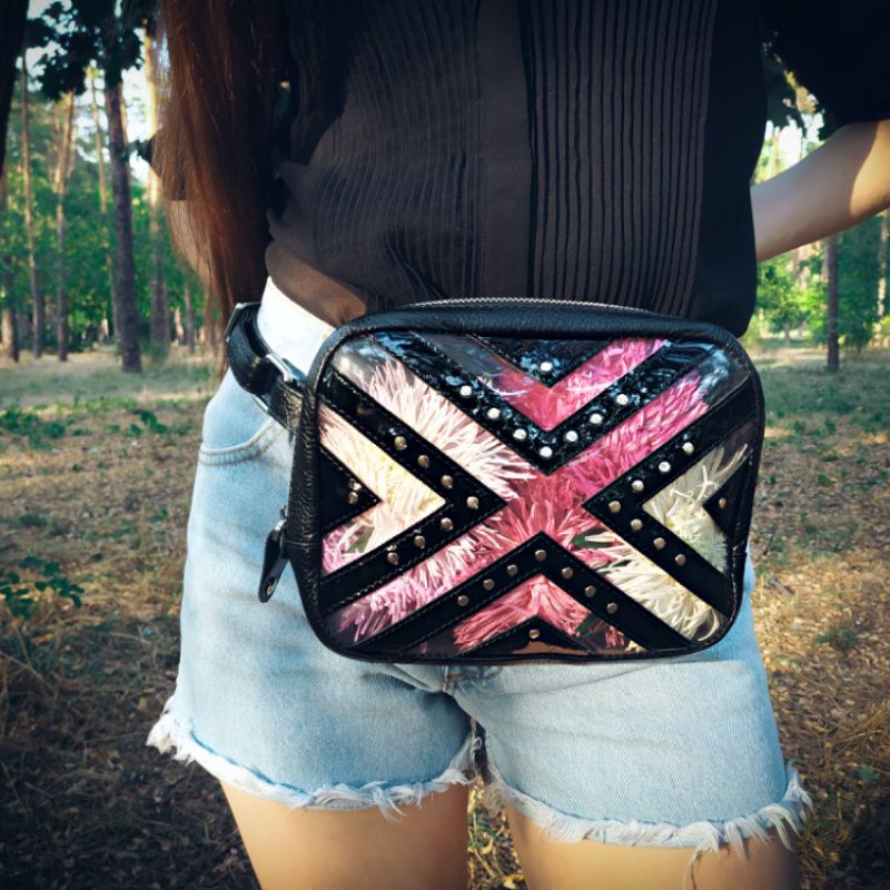 Это идеальная сумка для стильных девушек, которые ведут активный образ жизни. Передняя часть сумки выполнена из лакированной кожи черного цвета и имеет прозрачную основу с заклепками. Яркий дизайн этой кожаной сумки не даст вам потеряться в толпе. Это идеальное и безопасное место для ваших денег и телефона во время путешествий, фестивалей и вечеринок. С этой сумкой ваши руки освободятся. Он также станет прекрасным подарком для друзей, дня рождения, юбилея, Дня святого Валентина, Рождество, выпуска, праздников, свадебный подарок и особого дня. Кожаная сумка имеет два кармана на молнии (вверху и сзади). Кожаная поясная сумка имеет внутри одно большое отделение и один карман для кредитных карт и денег. Ремешок на талии полностью регулируется. Размер поясного ремня 79-109 см. Сумка сделана на подложке.