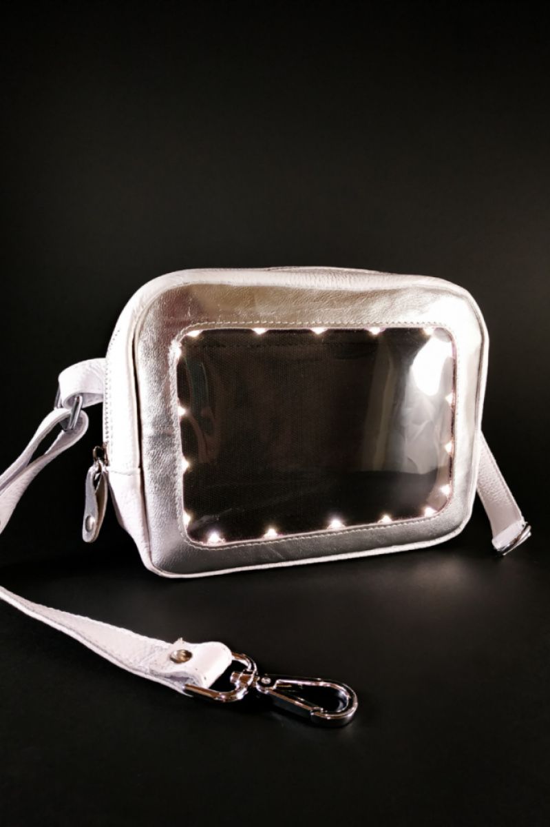 Это идеальная сумка для стильных девушек, которые ведут активный образ жизни. Передняя часть сумки выполнена из кожи серебристого цвета и имеет прозрачную основу с подсветкой внутри. Яркий дизайн этой кожаной сумки не даст вам потеряться в толпе. Это идеальное и безопасное место для ваших денег и телефона во время путешествий, фестивалей и вечеринок. С этой сумкой ваши руки освободятся. Он также станет прекрасным подарком для друзей, дня рождения, юбилея, Дня святого Валентина, Рождество, выпуска, праздников, свадебный подарок и особого дня. Кожаная сумка имеет два кармана на молнии (вверху и сзади). Кожаная поясная сумка имеет внутри одно большое отделение и один карман для кредитных карт и денег. Ремешок на талии полностью регулируется. Размер поясного ремня 78-109,5 см. Сумка сделана на подложке. Подсветка внутри обеспечивает гирлянда из батареек AA, которую можно выключить кнопкой внутри сумки.