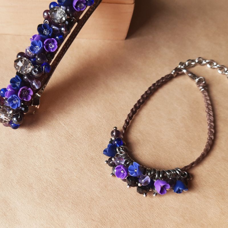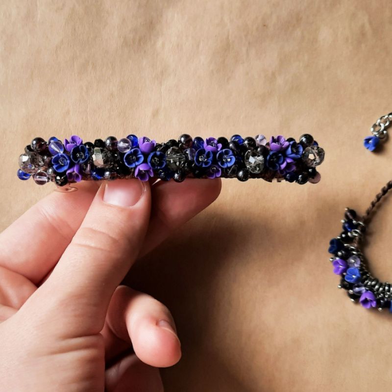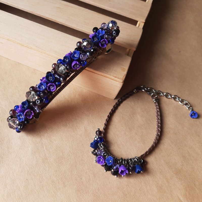 Комплект украшений заколка автомат + браслет на руку с миниатюрными цветами ручной работы из полимерной глины.