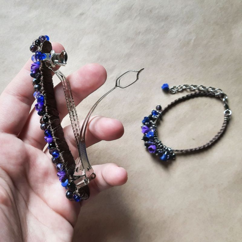 Можно выбрать цвет ленты на заколке и цвет шнурочка на браслете. Варианты: черный, коричневый, бежевый.