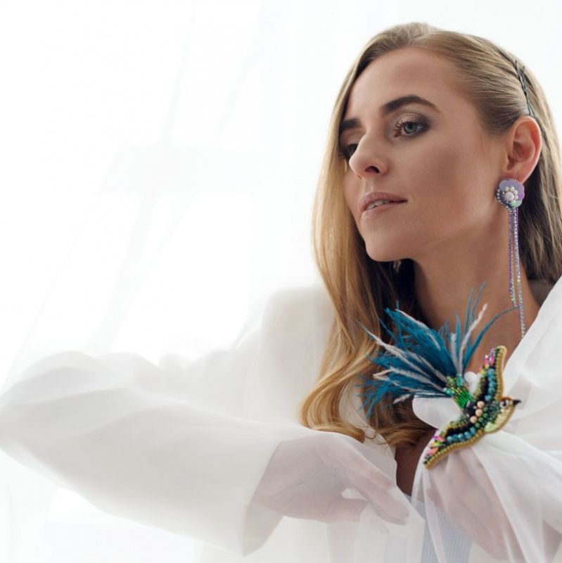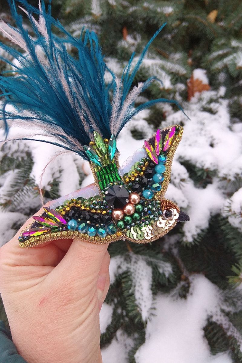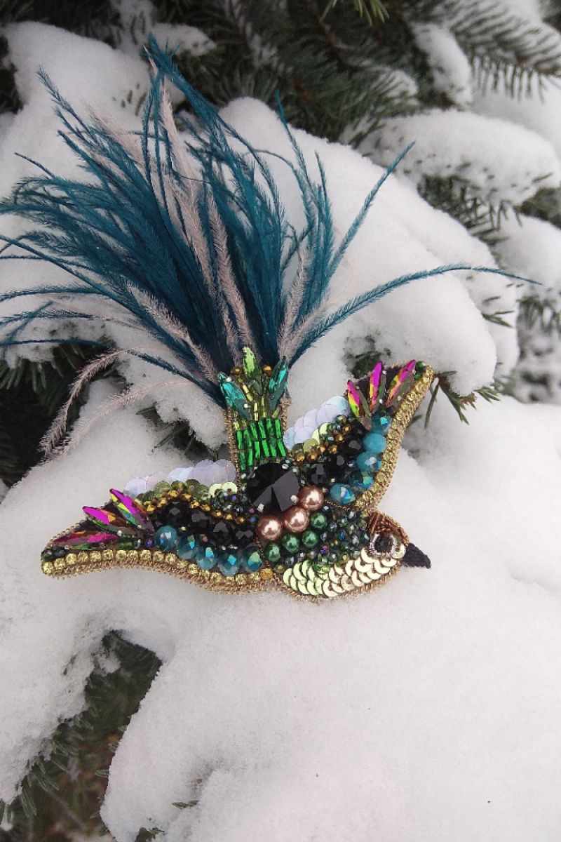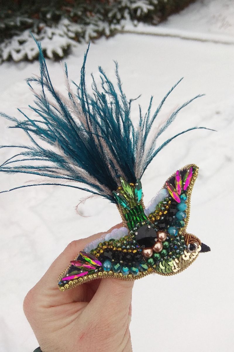 Брошь ′Птица′ с шикарными перьями переливается различными стразами, жемчугом Сваровски, хрустальными бусинами,пайетками, канителью,стразовой цепью.