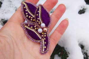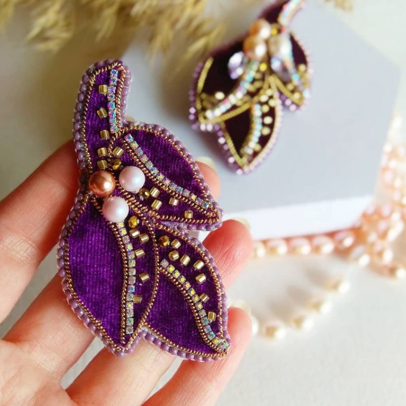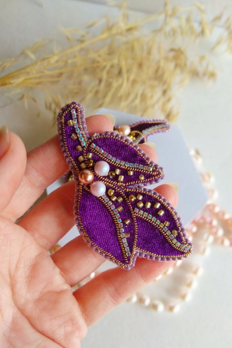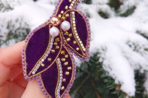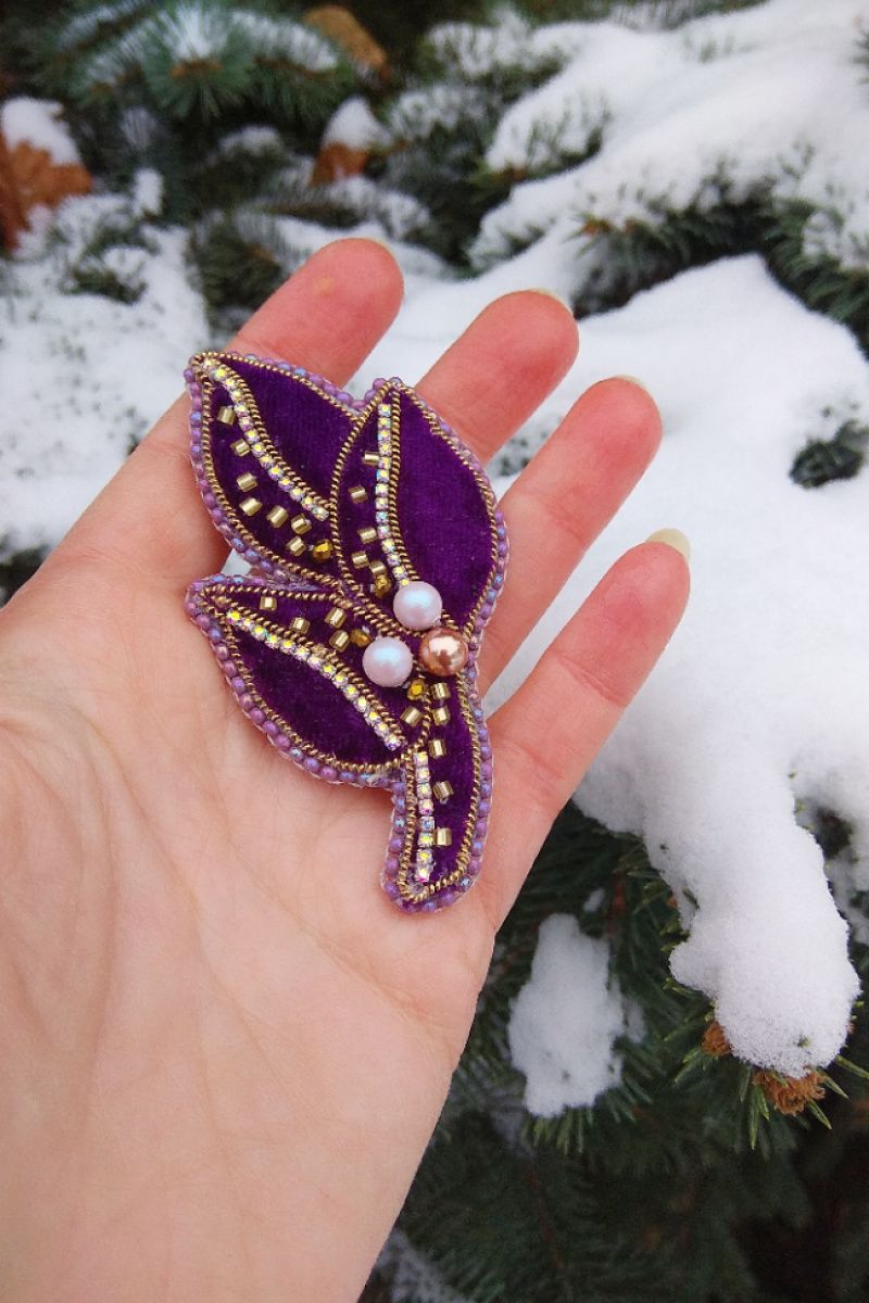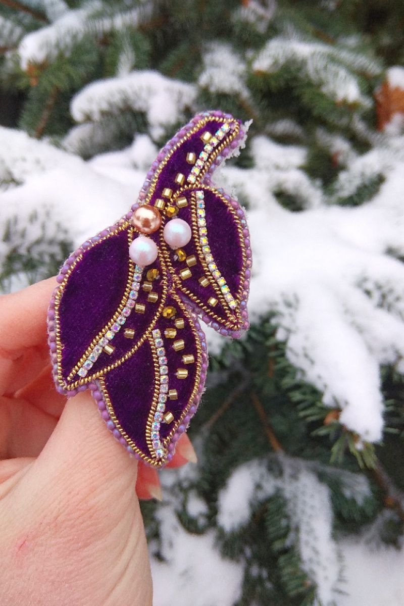 Брошь из бархата идеально впишется в ваш гардероб, так как форма веточки универсальна!