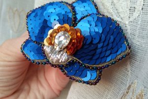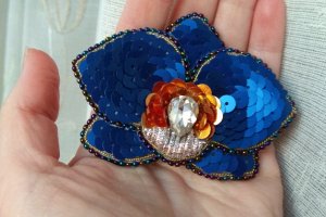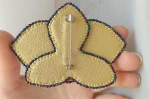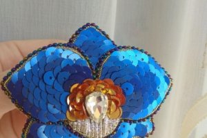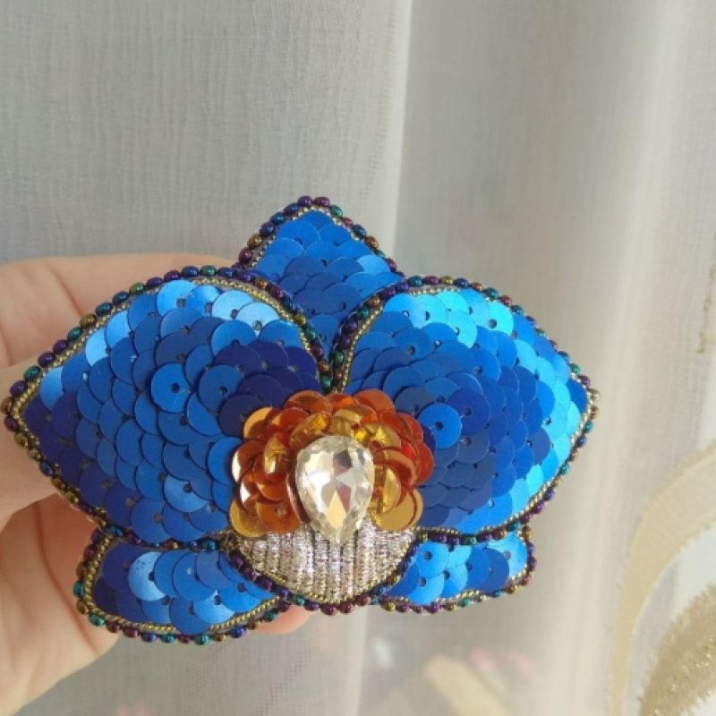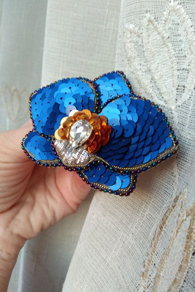 Брошь двухъярусная, выполнена из пайеток, жесткой канители, кристалла, канители трунцал, сзади основа эко-кожа и застежка для крепления.