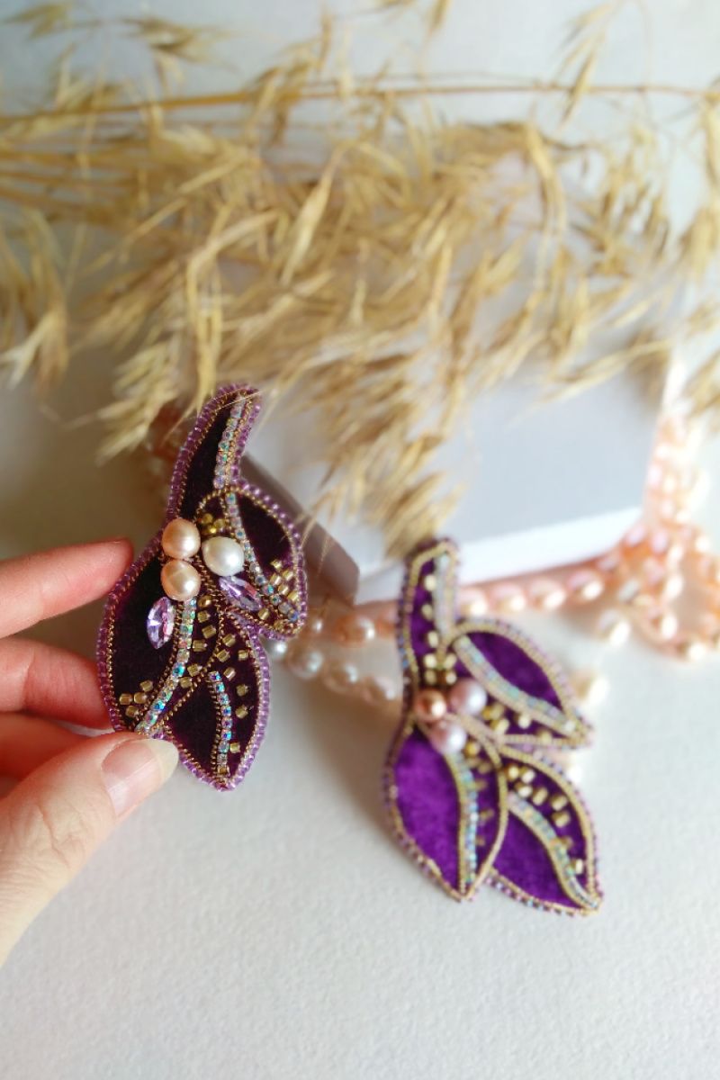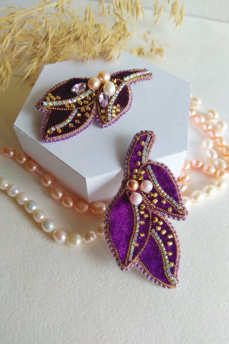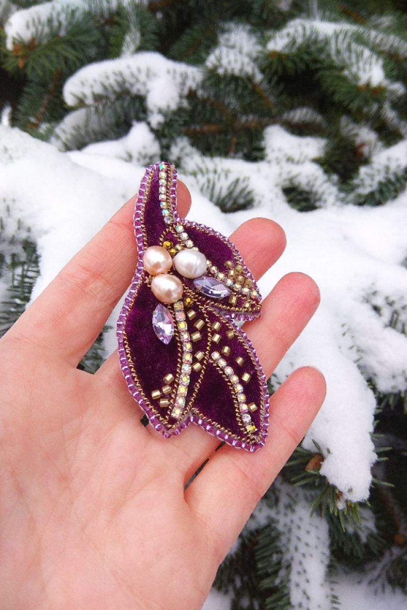 Брошь из бархата идеально впишется в ваш гардероб, так как форма веточки универсальна!