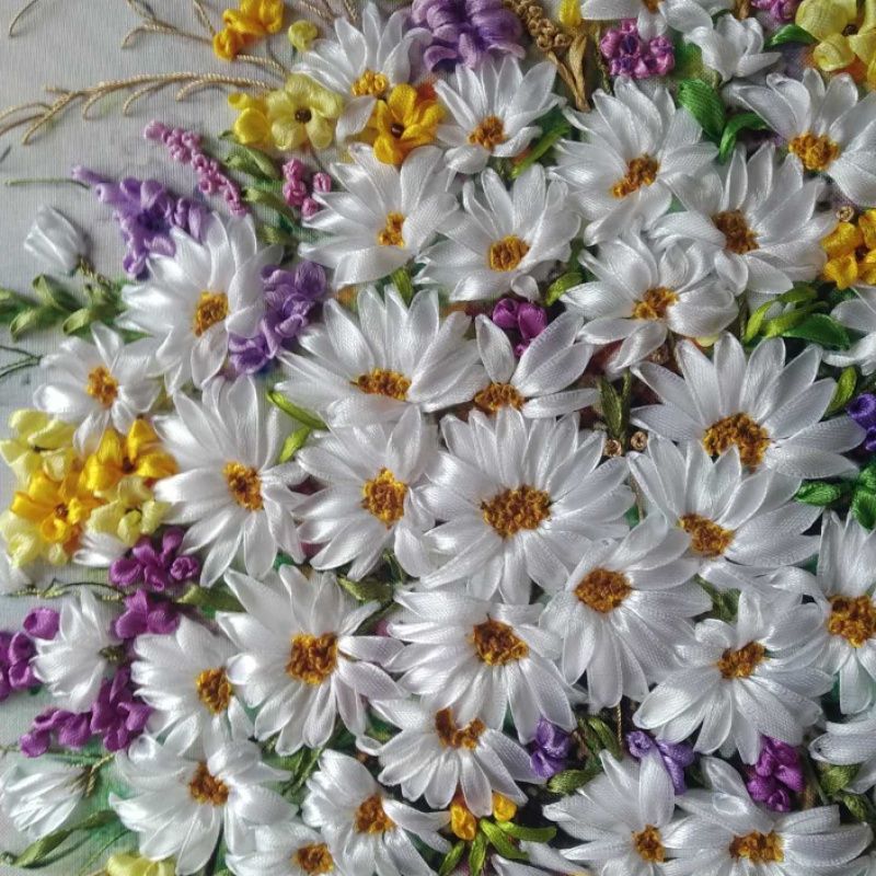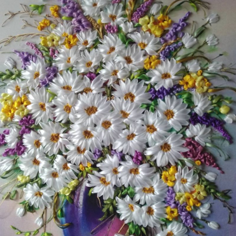 Картина вышита атласными лентами, бисером и шёлком на качественном принте. Наверное не найти людей, равнодушных к полевым цветам!! Пусть в вашем доме всегда ярко цветут эти маленькие звёздочки!!!! Размер 36*46, оформлена картина в паспарту.