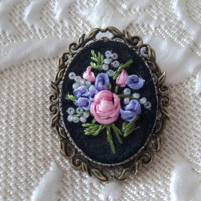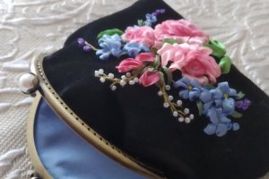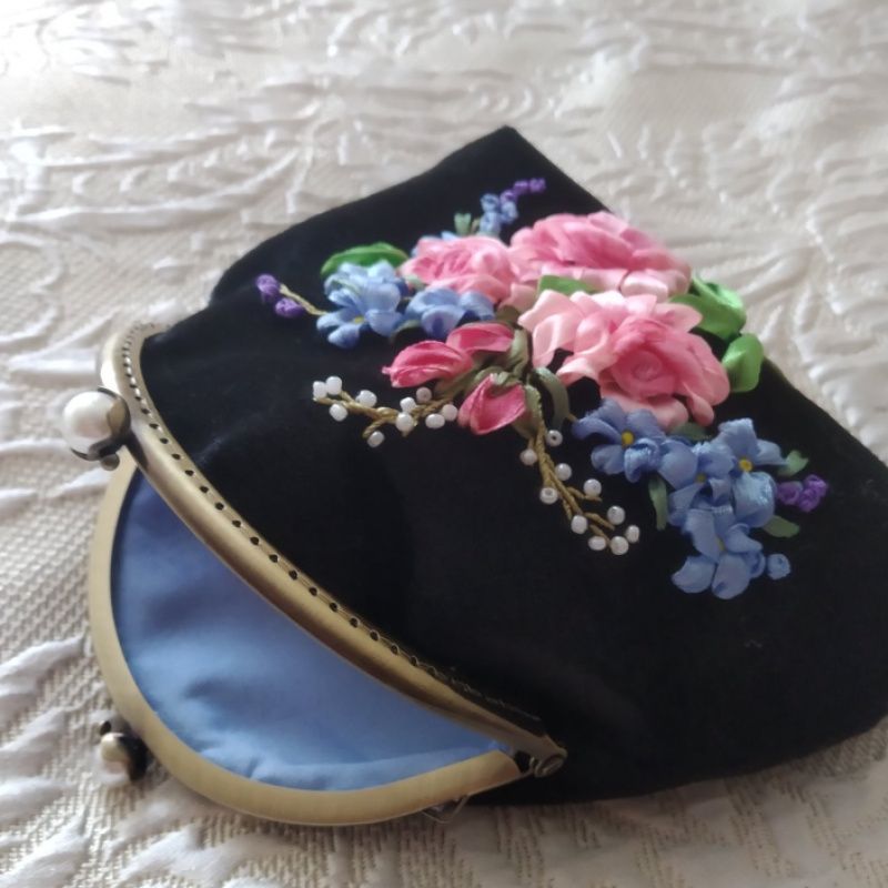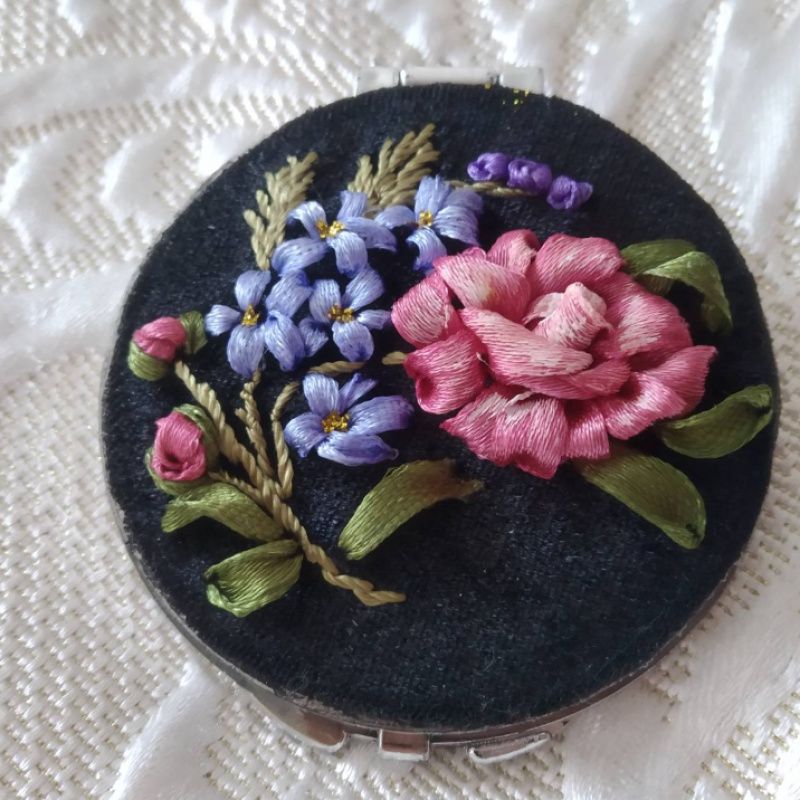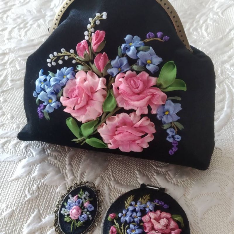 Набор состоит: косметичка ручной работы, ткань - чёрный велюр, на фермуаре, с вышивкой лентами. Зеркальце и брошь