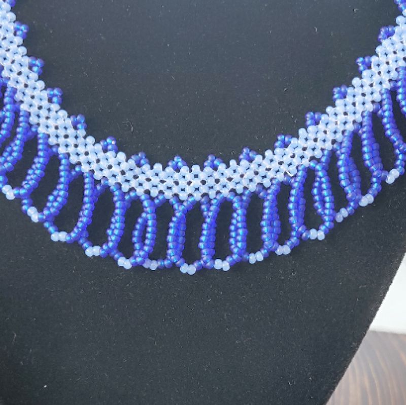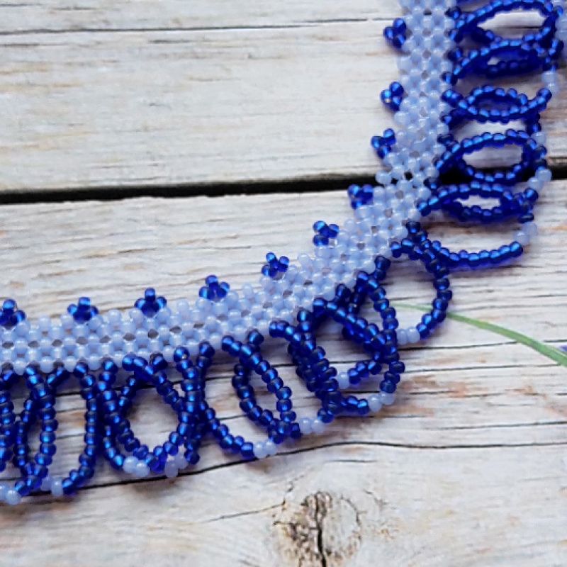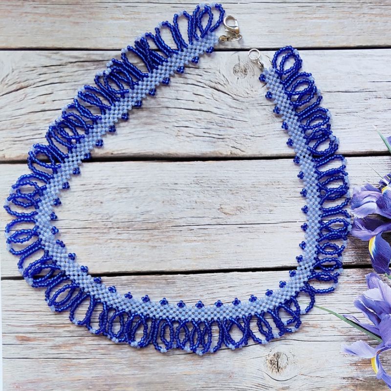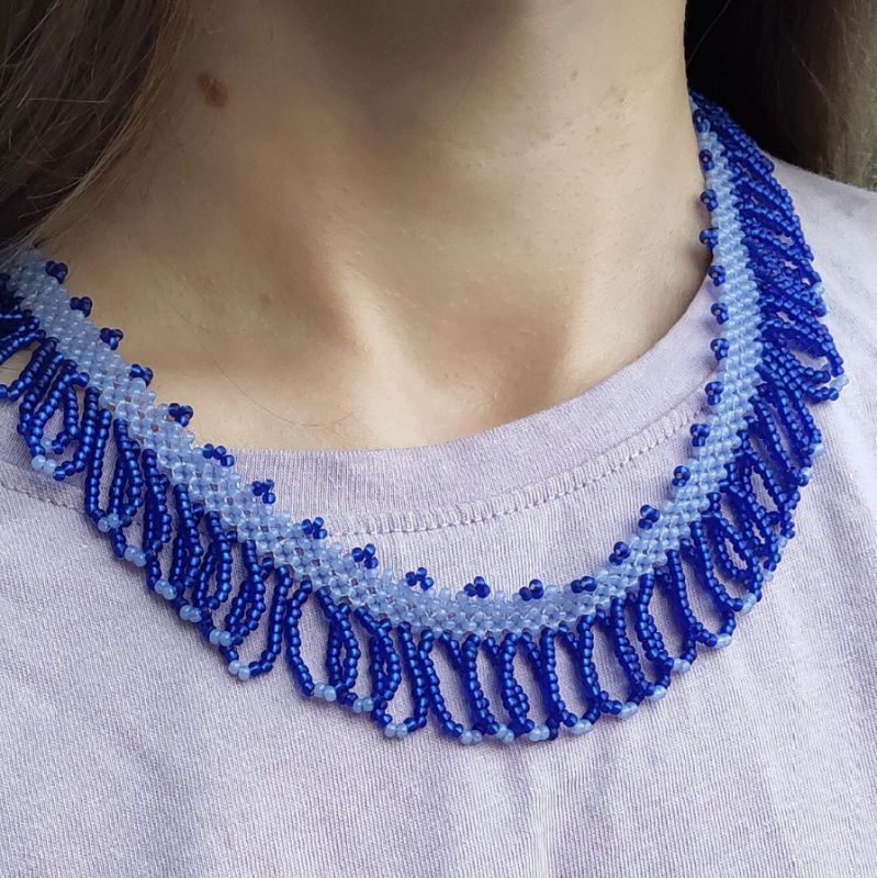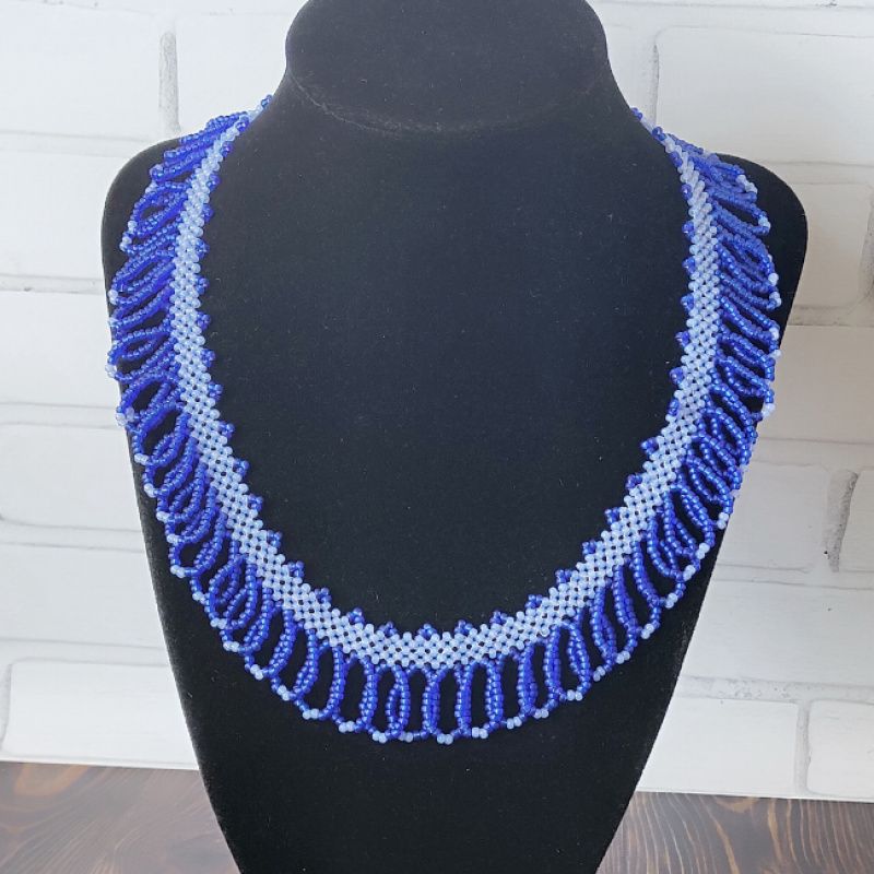 Хрупкое, но яркое колье из бисера в сочетании нежного голубого и насыщенно синего цветов. Длина колье - 46 см, ширина - 2,8 см. Также можно заказать в сочетании других цветов.