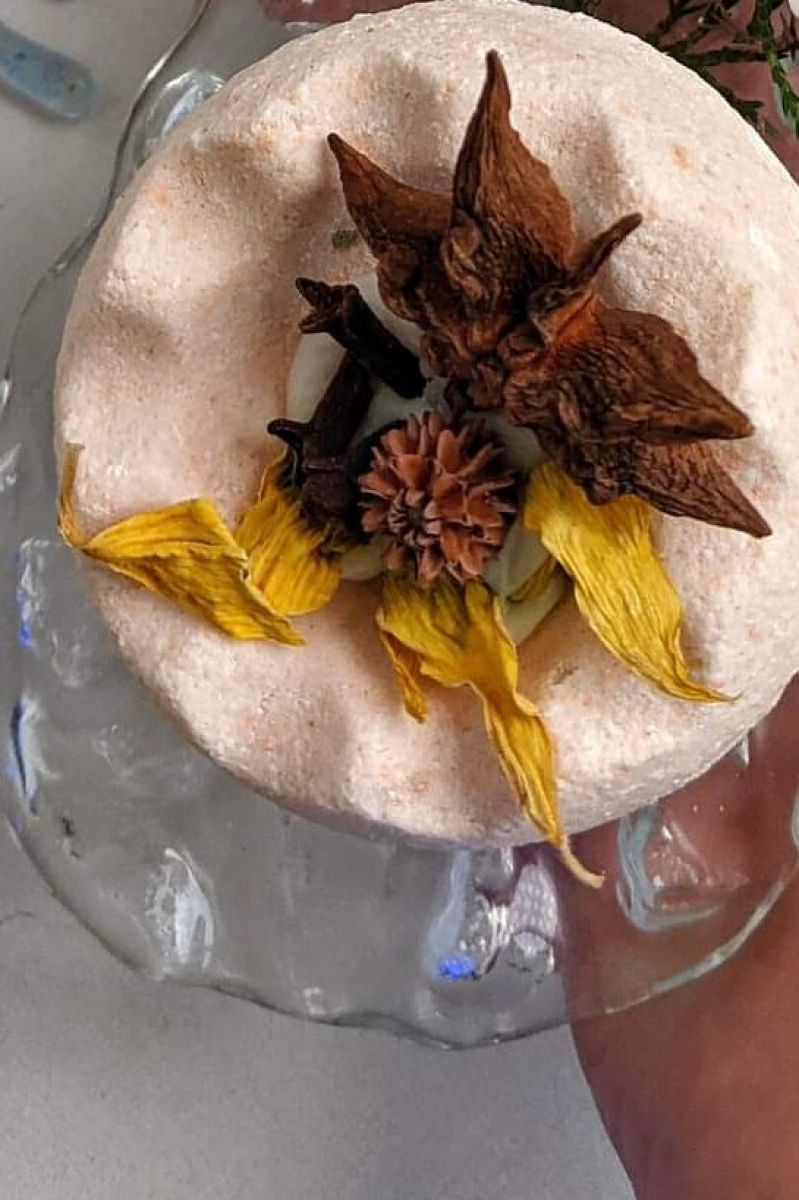 Праздничная бомба с имбирным порошком и праздничным декором, состав: пищевая сода, лимонная кислота, имбирный порошок, соль морская, кукурузный крахмал, пищевой краситель, масло рисовых отрубей, эфирное масло апельсин и имбирь.