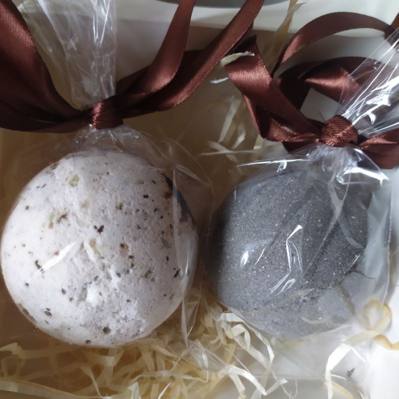 Набор бомб для мужчин, состав: сода пищевая, лимонная кислота, морская соль, кукурузный крахмал, масло оливковое, масло виноградных косточек (на выбор также авокадо, сладкого миндаля), в кофейник входит натуральный растворимый кофе и эфирное масло ванили, в чер глина и эфирное масло иланг-иланг.