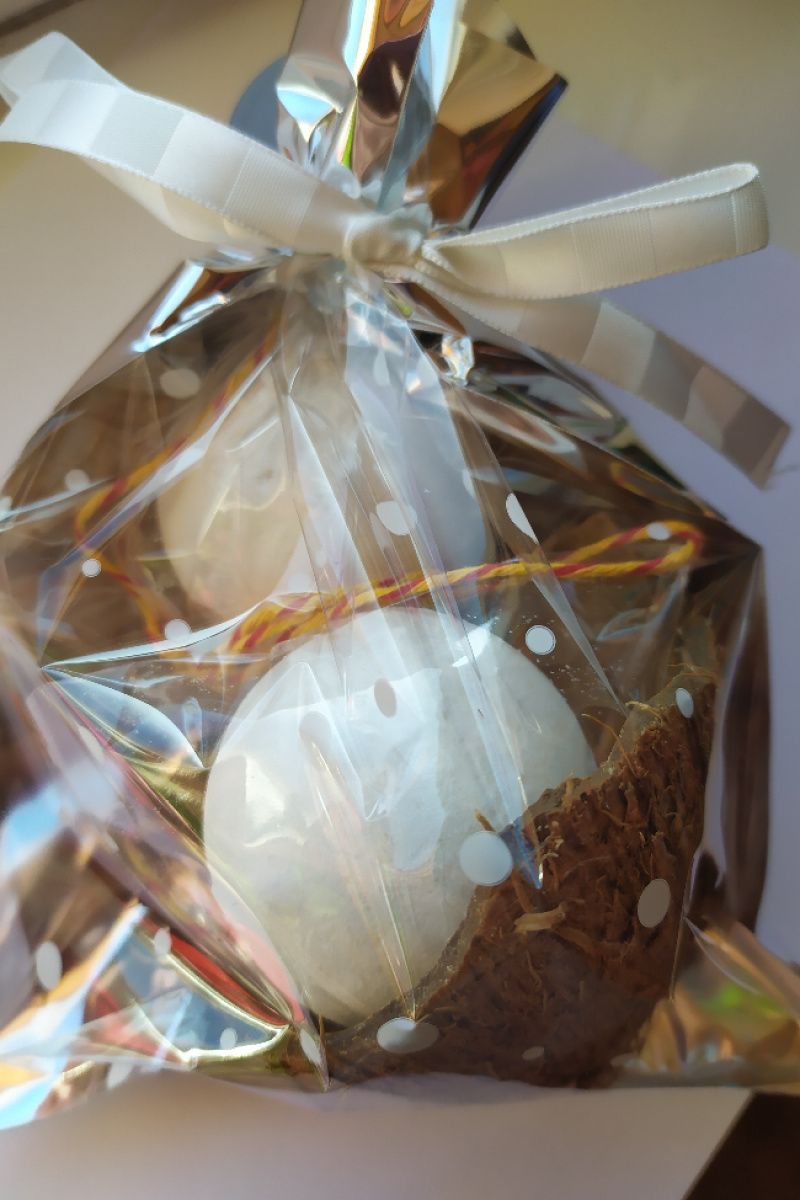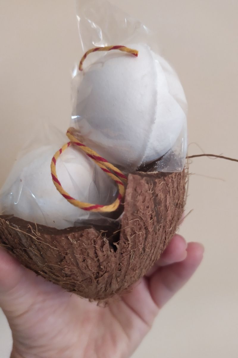 Подарочный набор из двух средних белоснежных кокосовых уходных бомб. Состав: пищевая сода, лимонная кислота, кукурузный крахмал, морская соль, кокосовое масло, кокосовая отдушка. Упаковка: подарочная обертка+кокосовая скорлупа.