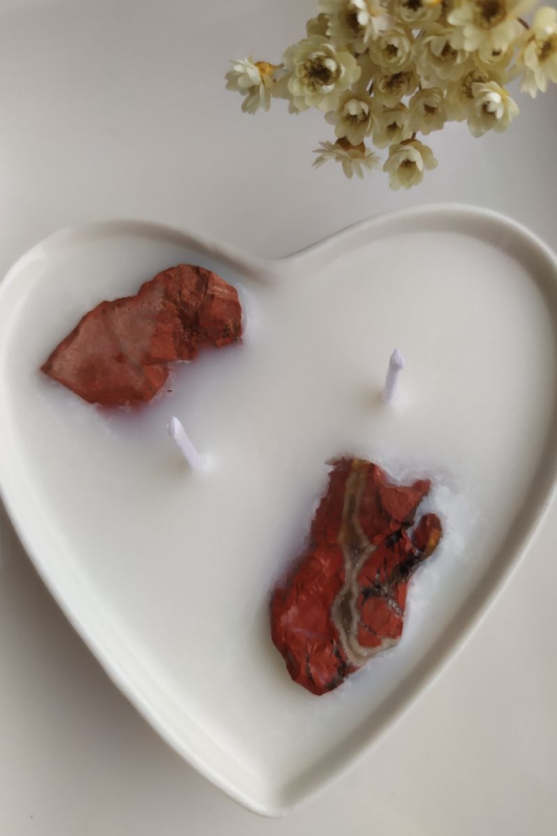 Свеча с камнем яшмой, при горении воск становится суперпрозрачным и в нем видны камни, свеча на два фитиля, к смеси растительных восков добавлено эфирное масло герани и лимона. Яшма подходит знакам зодиака Стрелец, Скорпион, Дева.